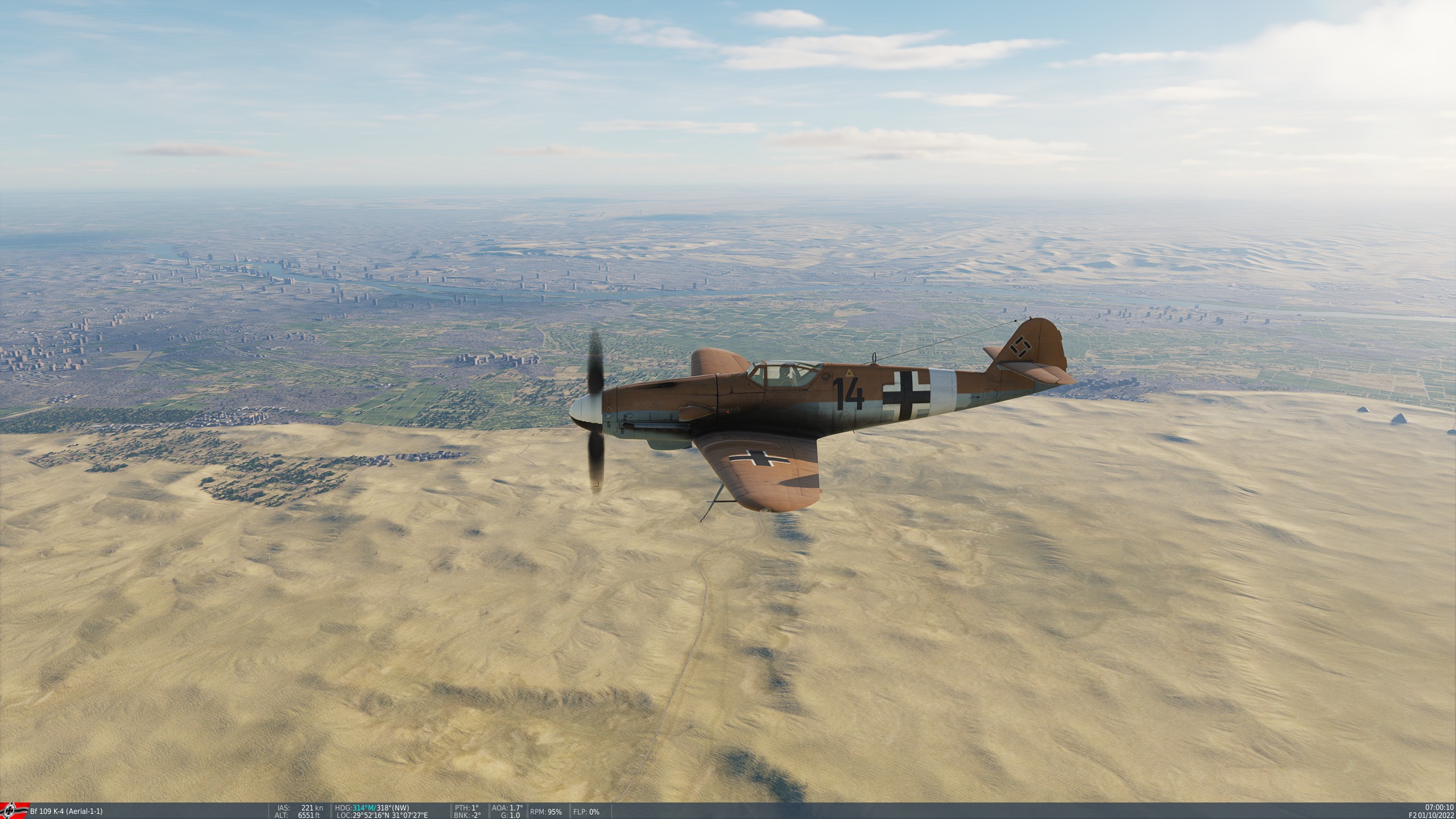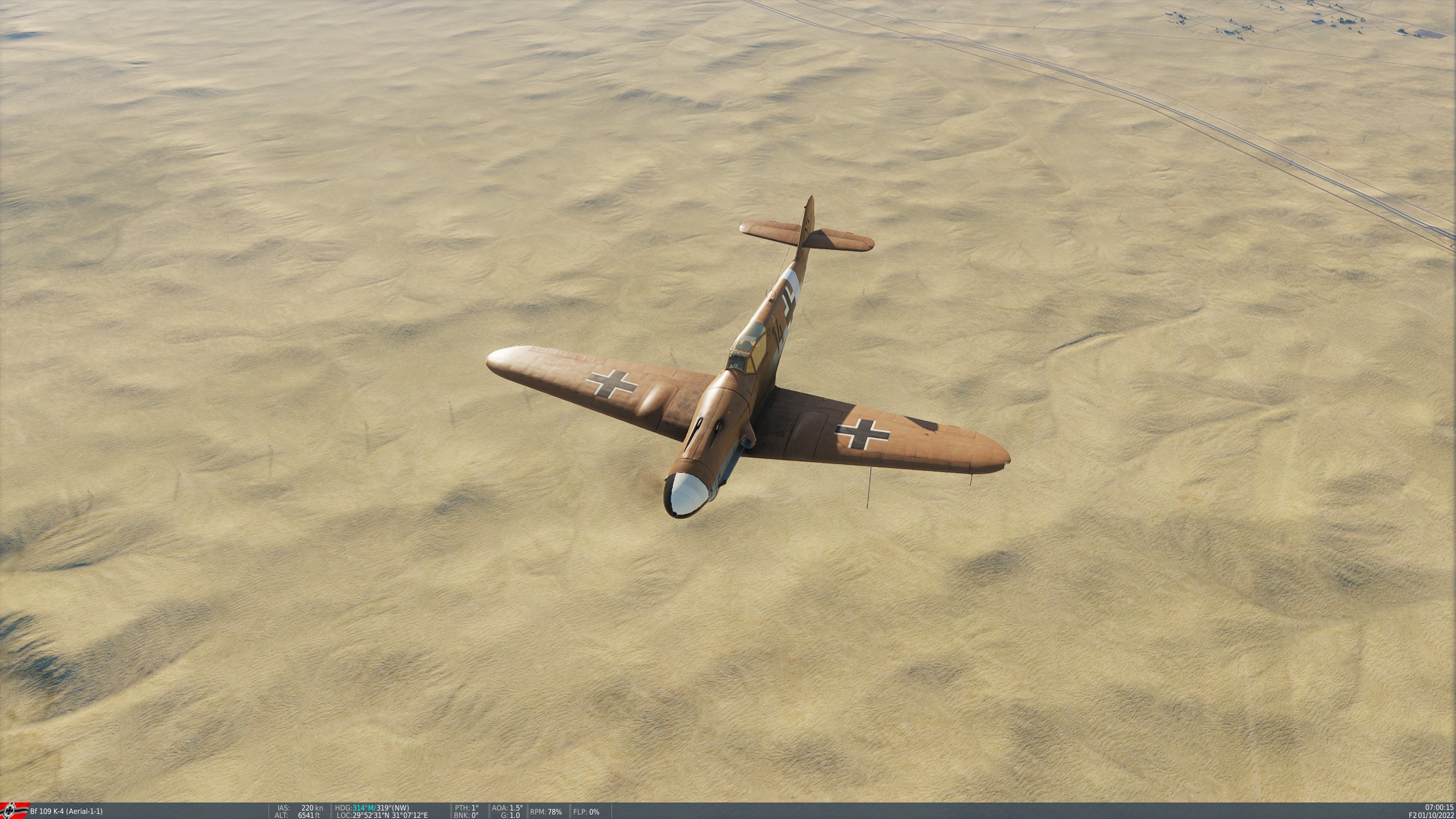 This skin represents a Messerschmitt Bf 109 G-2/Trop flown in the North African campaign, depicting the sun-faded desert camouflage typical of Luftwaffe aircraft operating with Jagdgeschwader 27 (JG 27) over Libya and Tunisia. The sand-yellow (RLM 79) upper surfaces and pale blue undersides (RLM 78) were applied in-theater to adapt to the harsh desert environment.