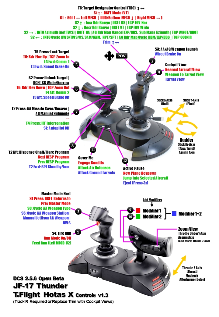 JF-17 Thunder T.Flight Hotas X (Thrustmaster) Profile v1.3 for DCS 2.5.6 Open Beta.  See included diagram for reference.  Requires 2 Modifier buttons for 4 command layers, axis assignments and TrackIR (or replace Trim commands with POV).  Underlined commands are likely still under development.  PowerPoint included so you can customise and reprint diagram.