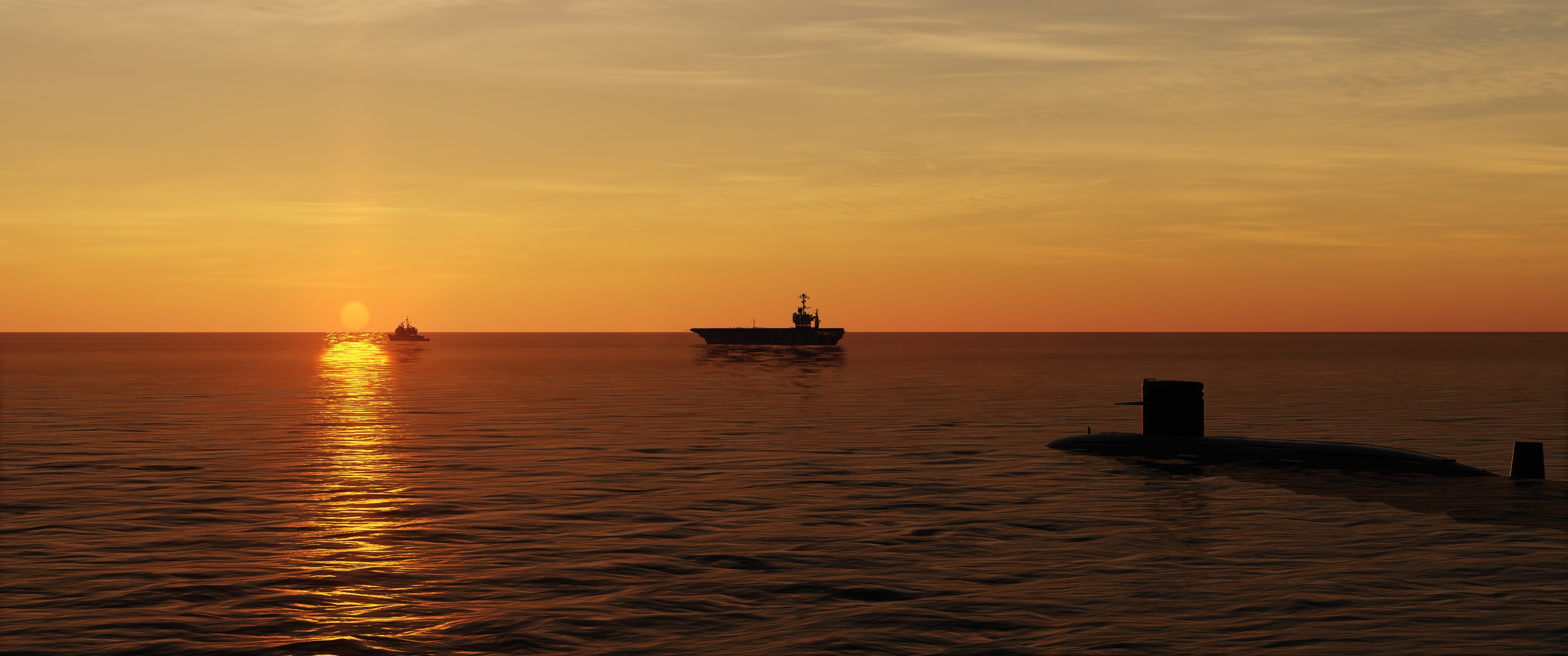 A large carrier battlegroup with busy (but still functional) Carrier decks, including the Supercarrier GW, HMS Invincible and Tarawa.