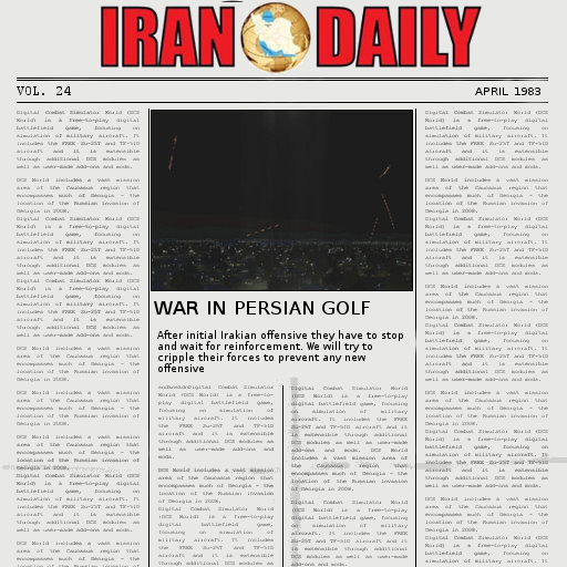 April 1983, after the Iraqi brutal aggression against Iran in 1980 the 22nd of september, our army was able to repulse the enemy with the precious help of our Air Forces. The frontline is stabilized and the enemy is now trying to destroy our industrial sites and to terrorized our population bombing our cities. The mission of Islamic Republic of Iran Air Force is to stop enemy bombers, to attack the Irakian troops all along and back to the frontline and to respond with air raids on Irakian cities to their terror bombings.