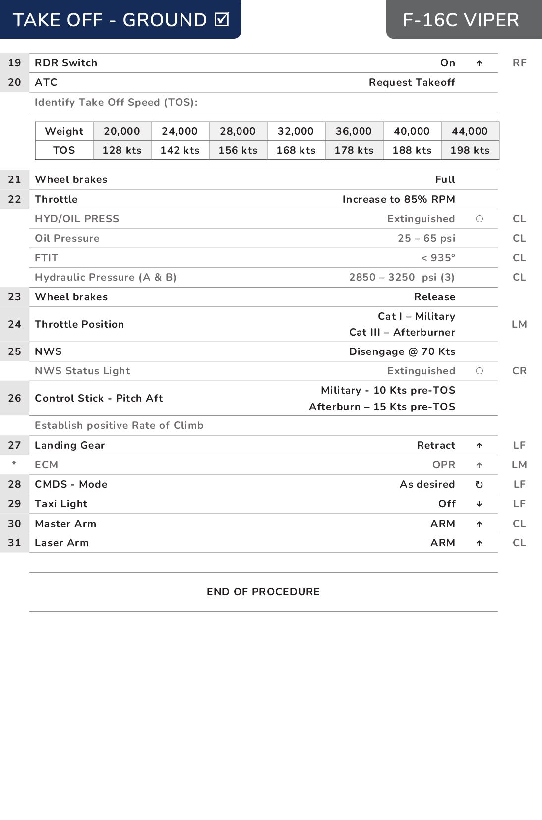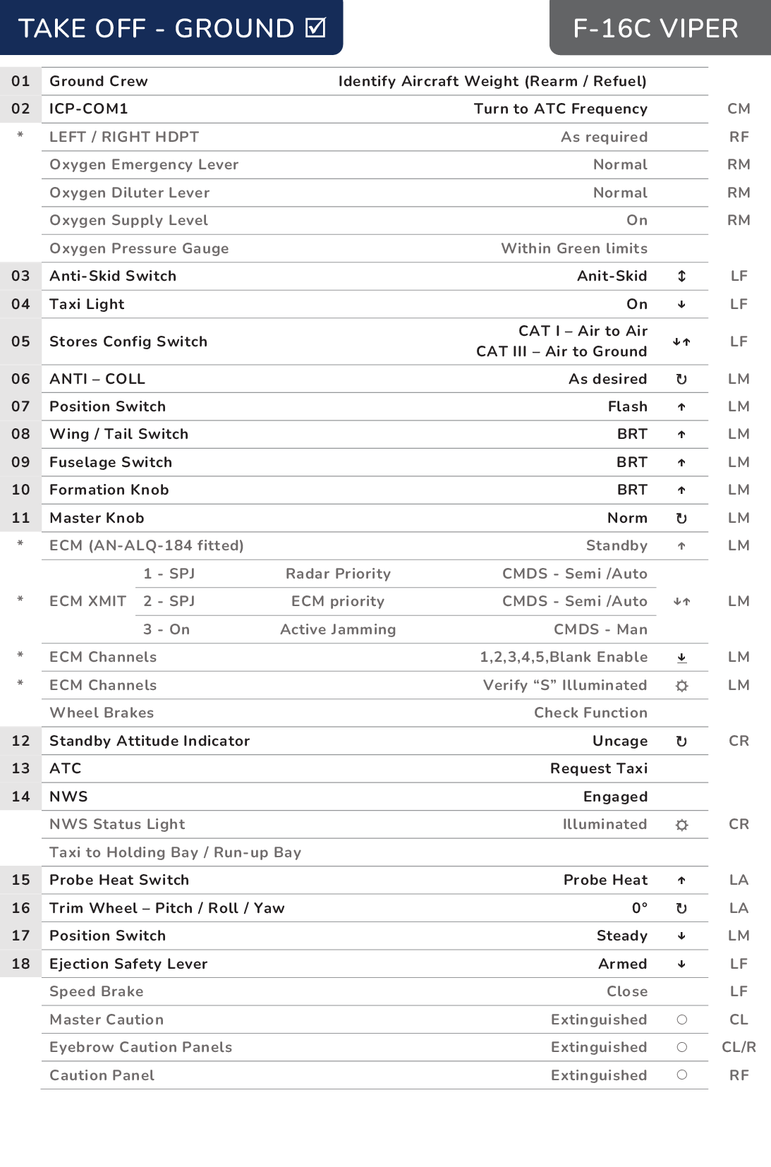 A simple yet detailed enough kneeboard checklist for the F-16C Viper with procedures for startup, take-off, landing and AAR.
