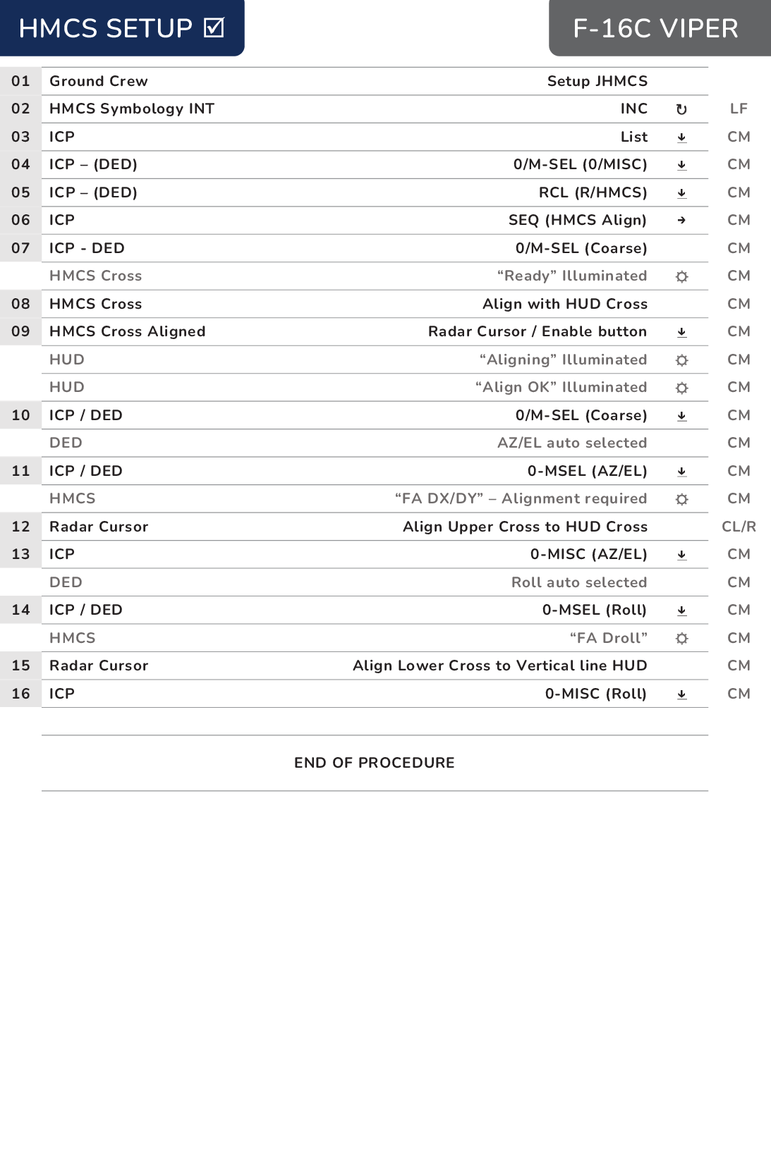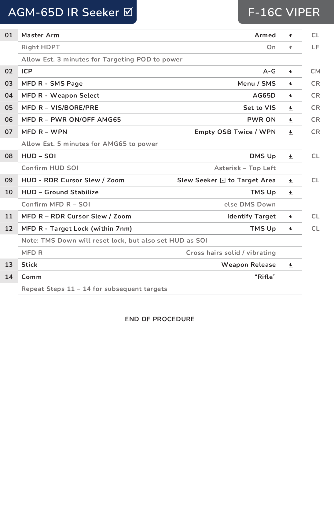 This is an enhanced checklist for the F-16C Viper. It includes optimized startup, takeoff, cruise, fence in/out, refueling, approach, and landing checklists.