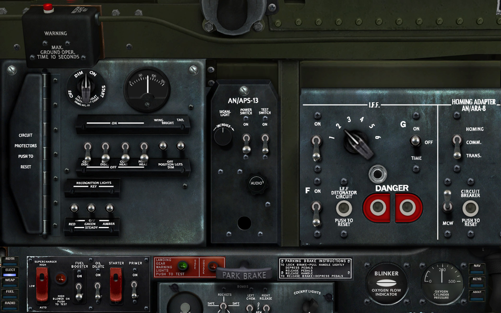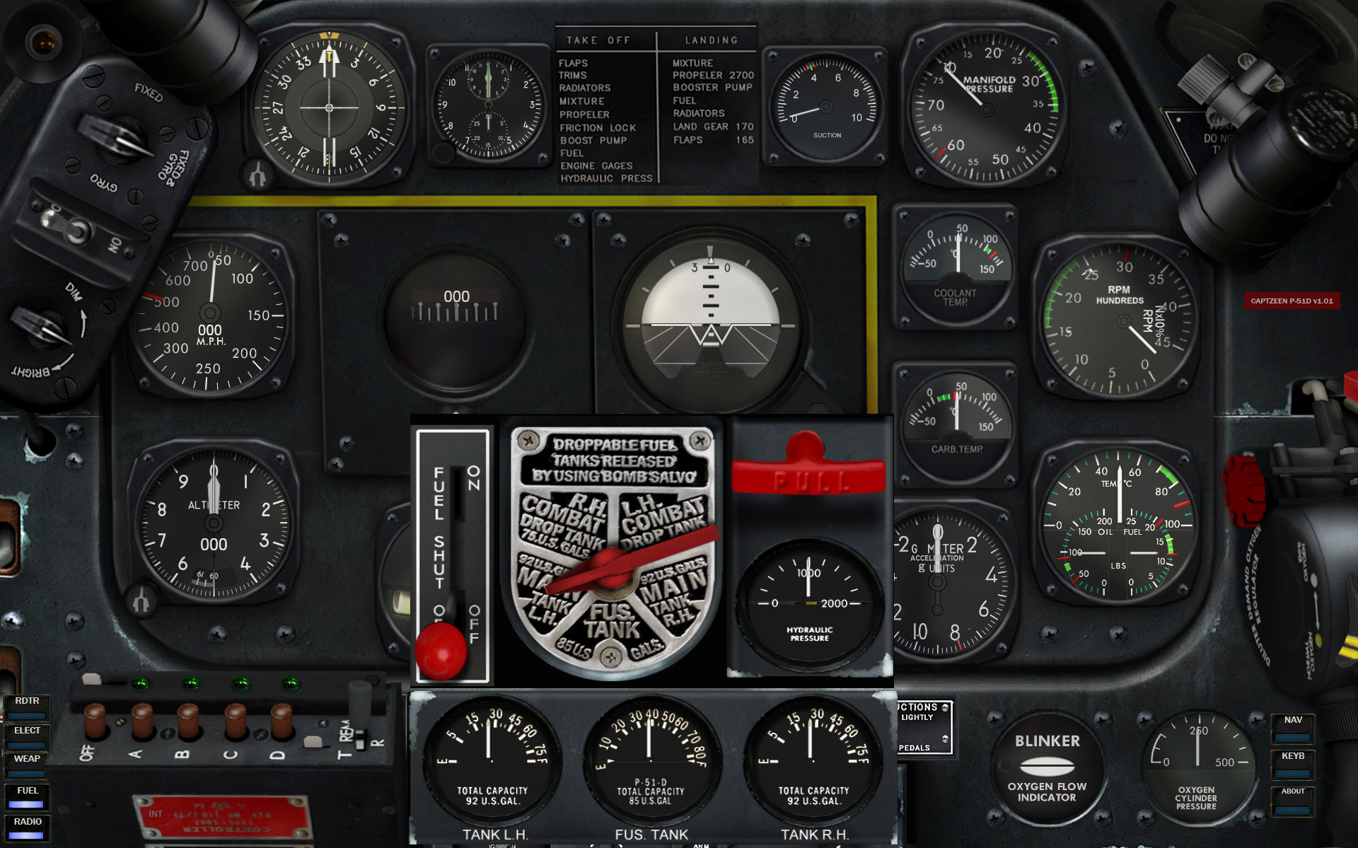 landing unsafe light, high blower light, oxigen flow, oxigen press, hydraulic press, Anmeter, left tank fuel, fuselaje tank fuel, right tank fuel,