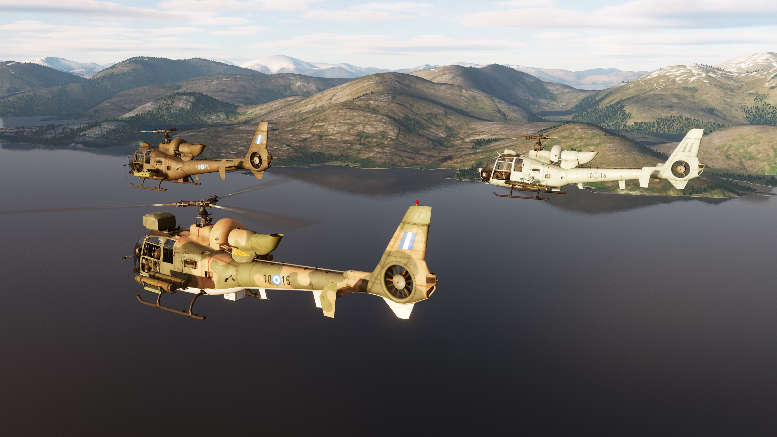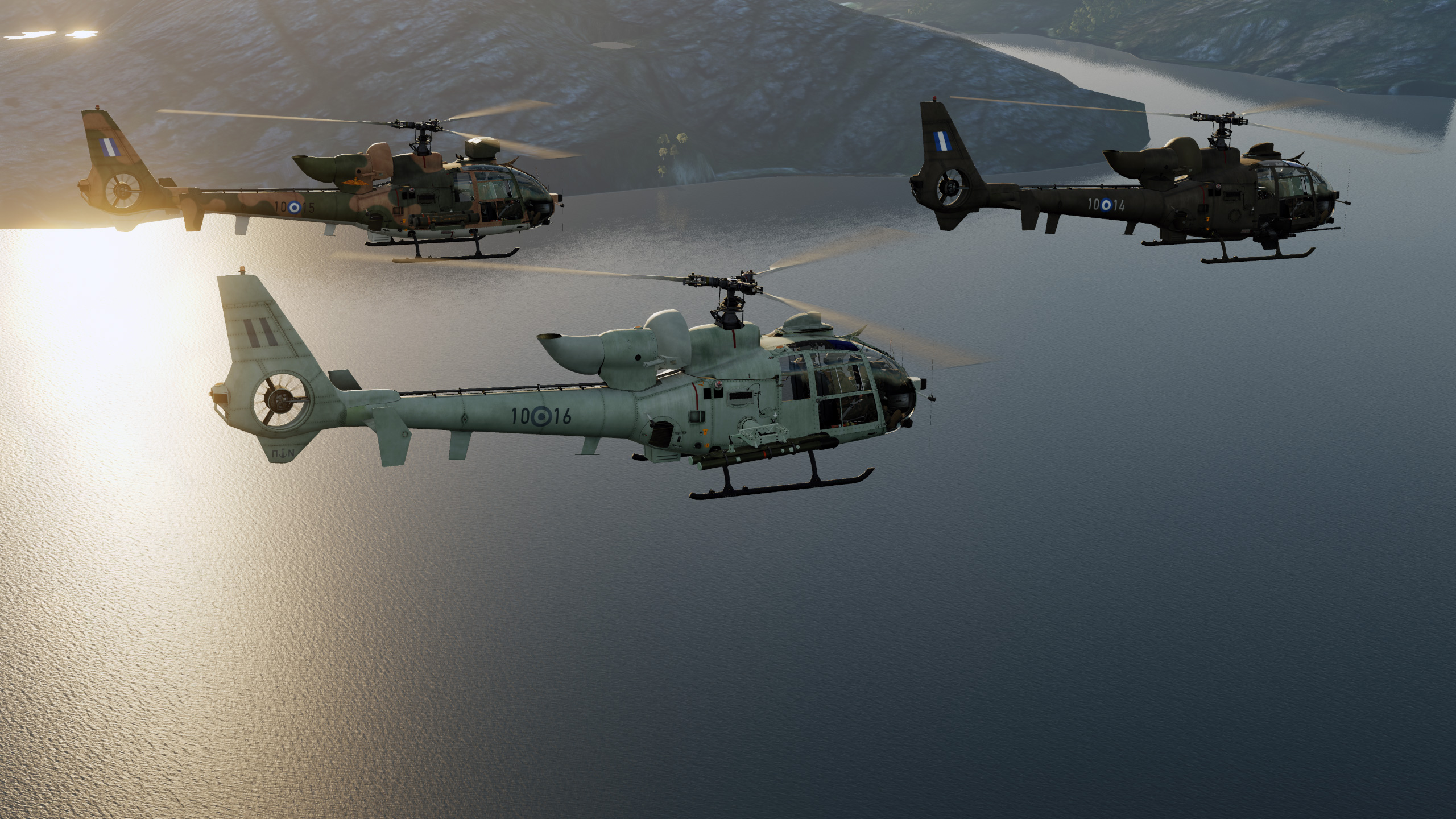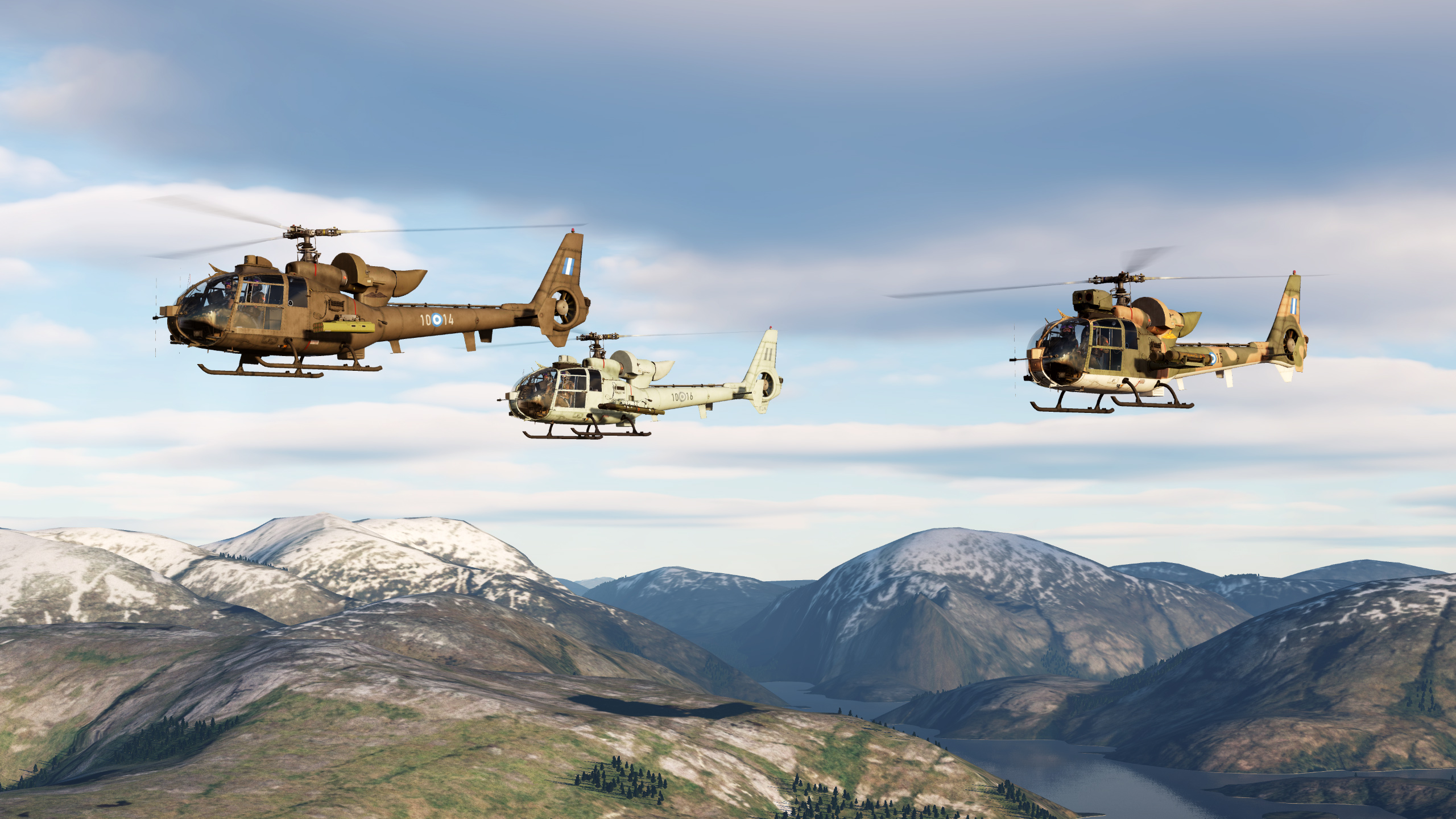 A set of three fictional Hellenic SA342 based on historic liveries of alternate airframes.