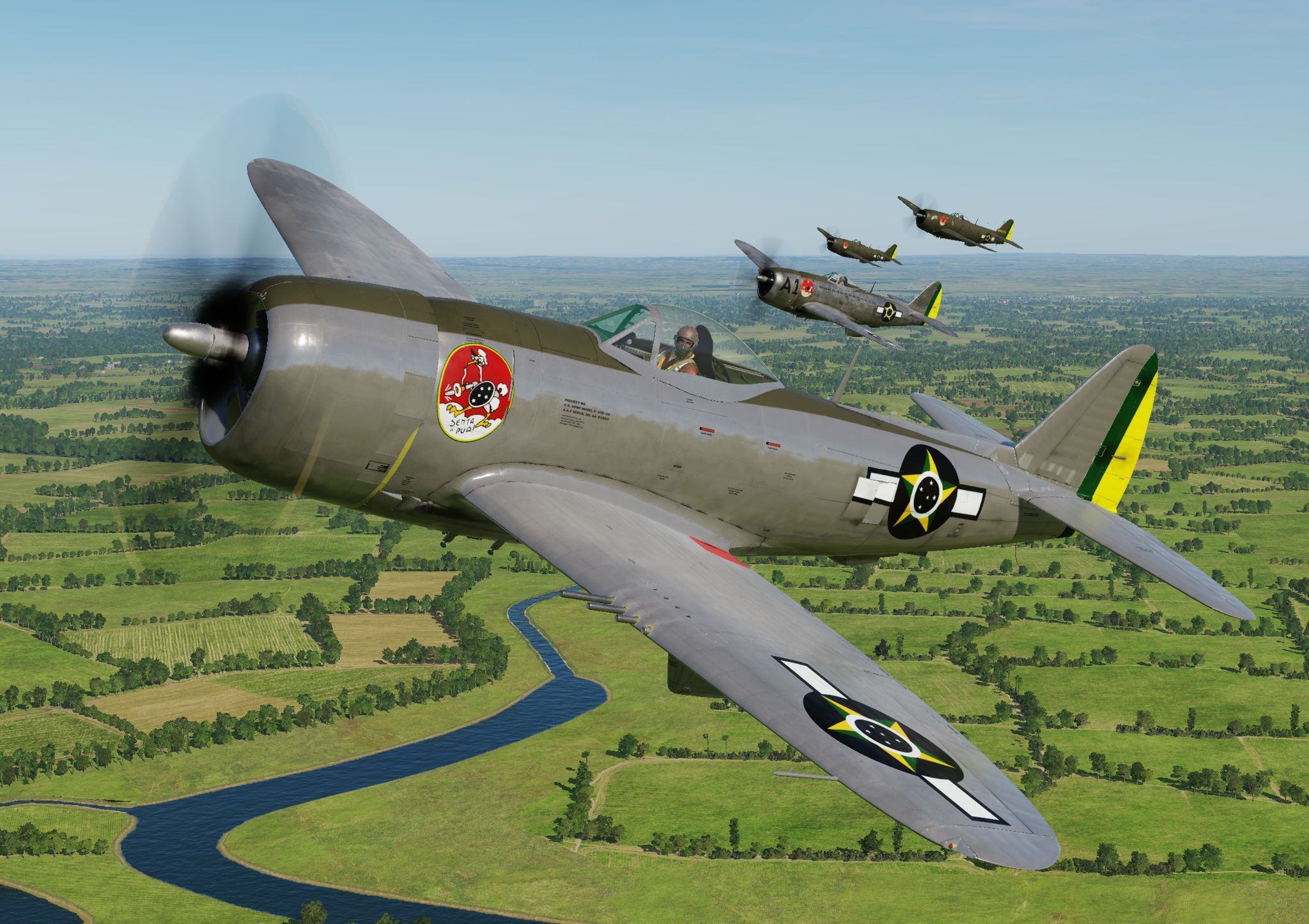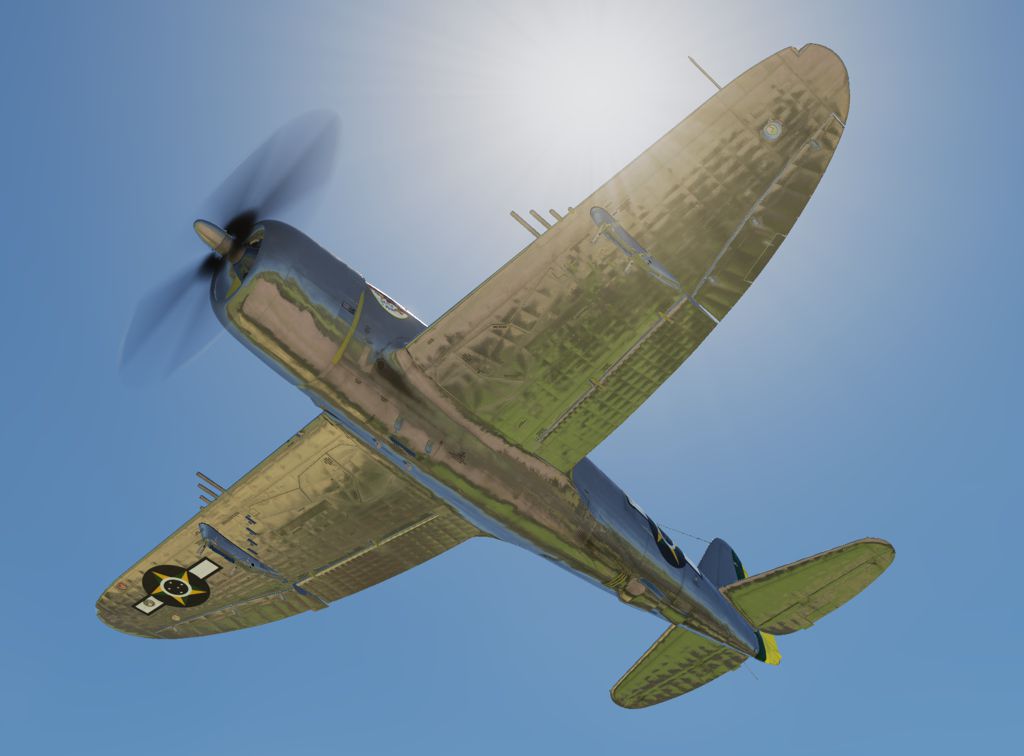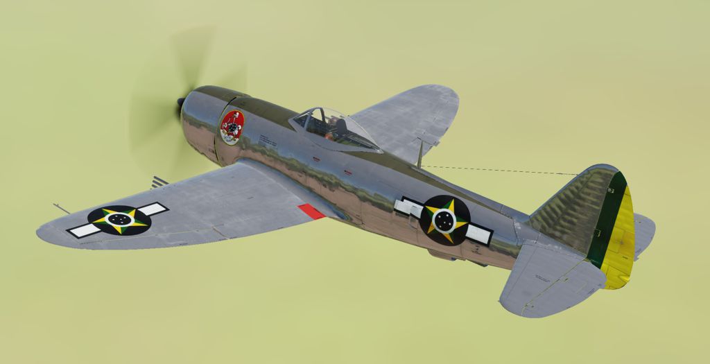 (update vs 2.2 - Initial release with New Spinner, New inter-cooler doors, Reworked Cowling latches, Early acft with new anti-glare, vertical stab fin bare metal, Radio mast in anti-glare, several new details and cosmetics, New template with wireframe, reworked anti-glare, reworked rudder, Chrome spinner, New Jambock Pilot included, Chrome MG Covers,  Covers all P-47D Models  and  cosmetics)