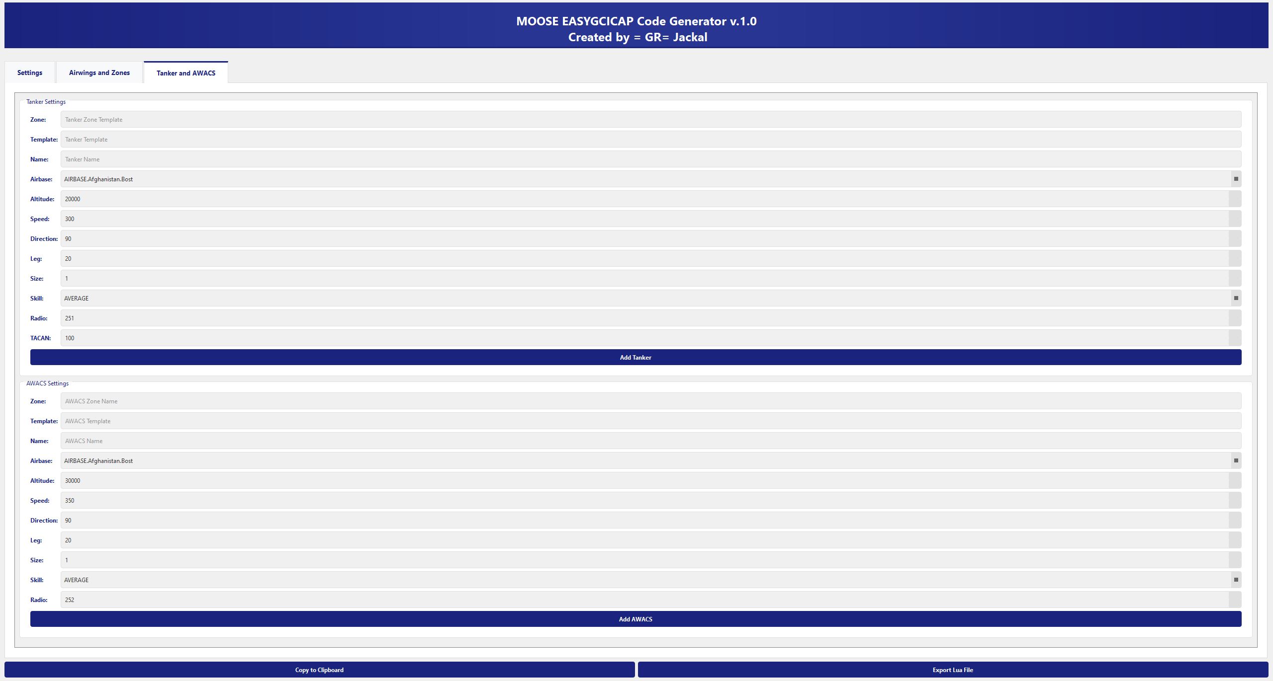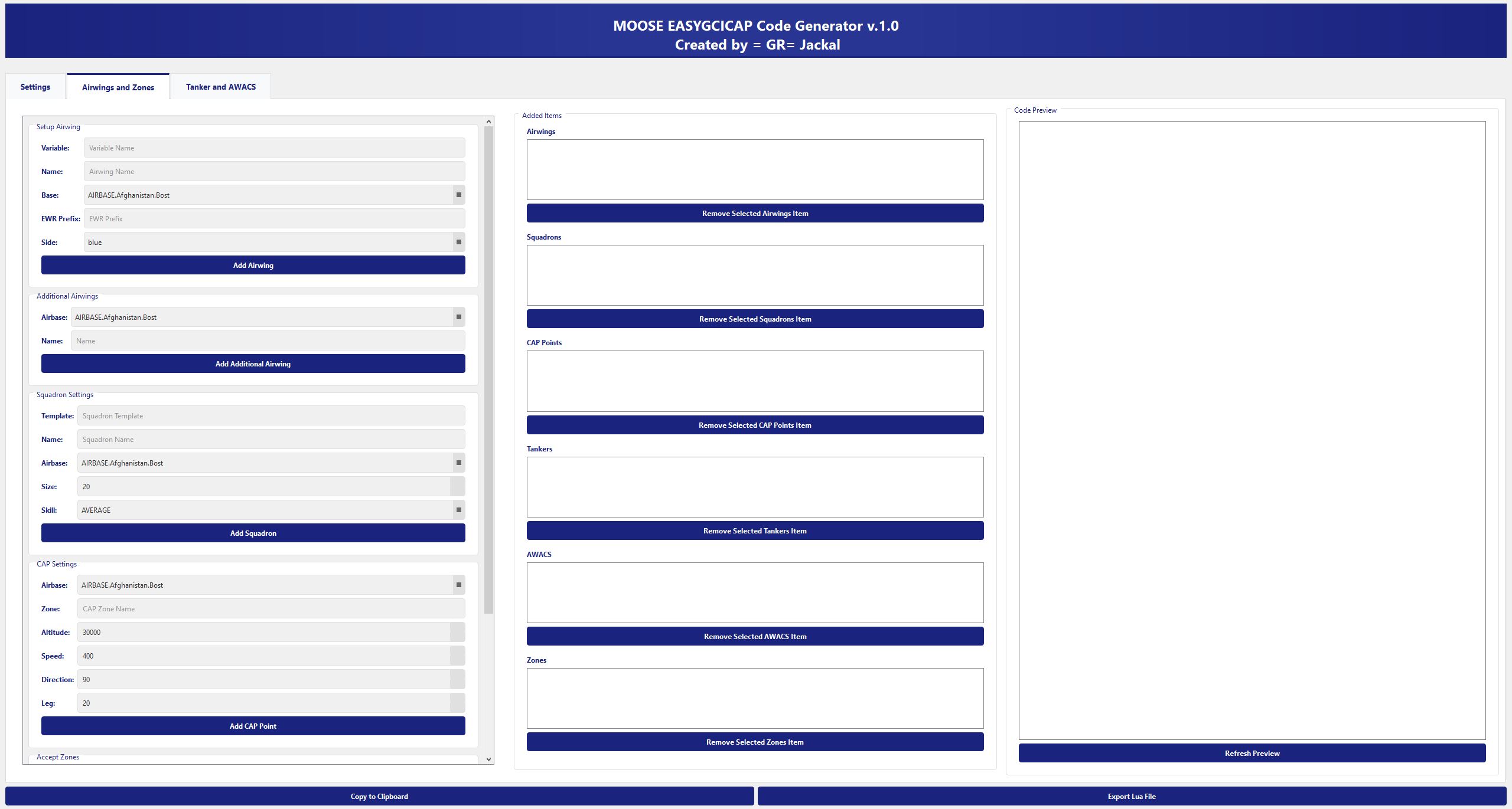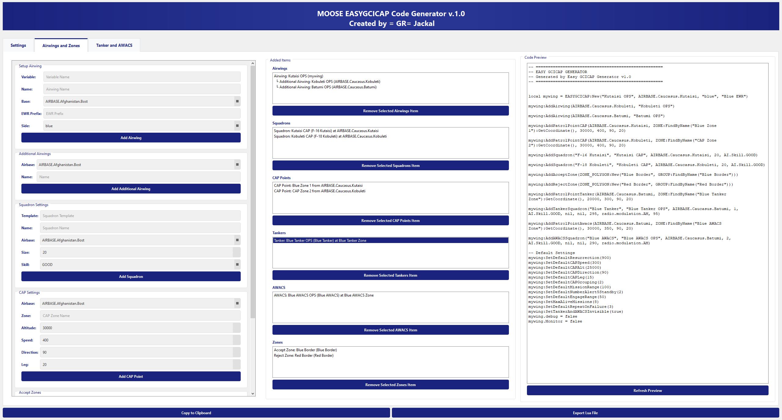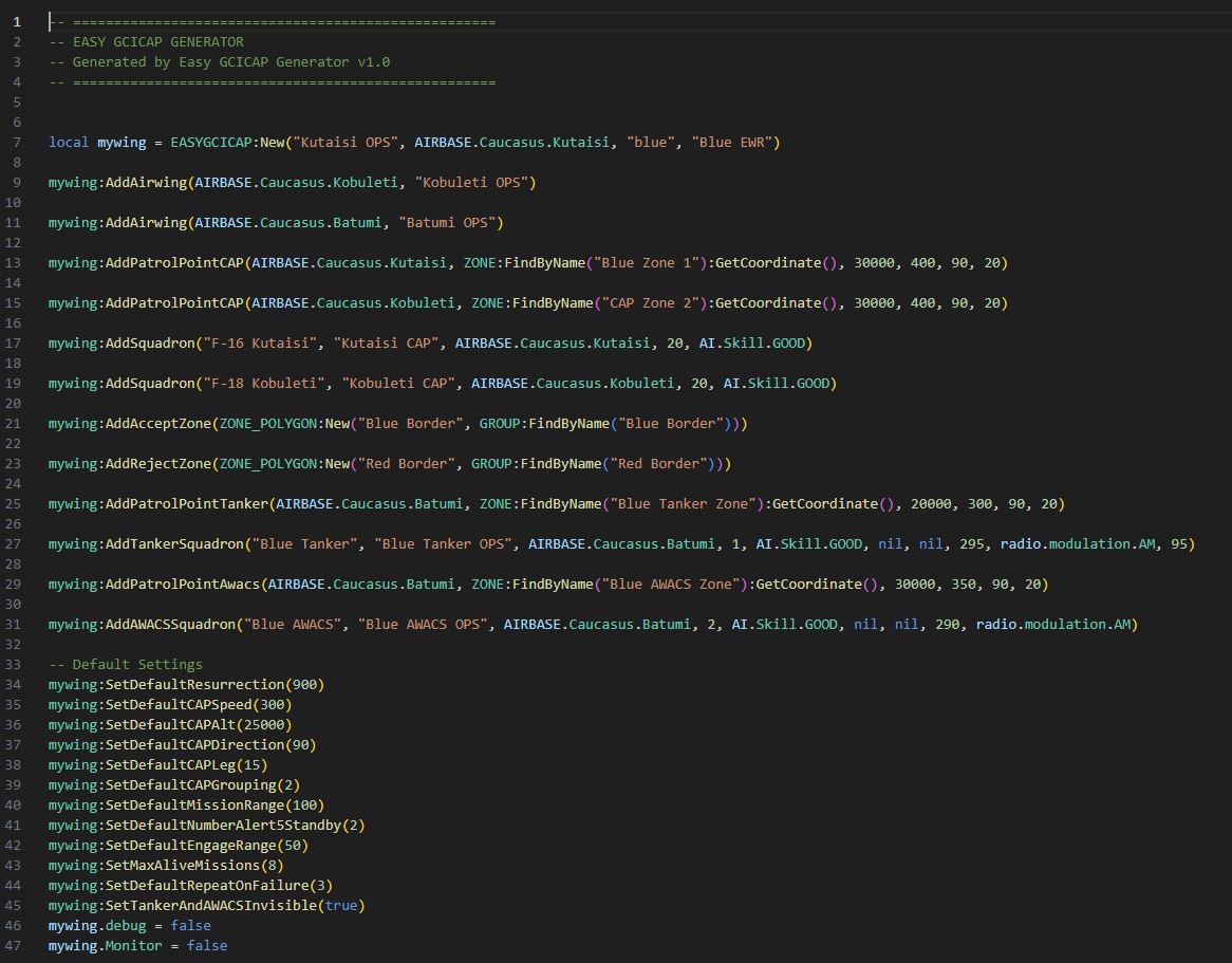 This program allows users to setup their MOOSE EASYGCICAP class for their missions without having to code in Lua. The program generates Lua code by itself, based on user’s inputs.