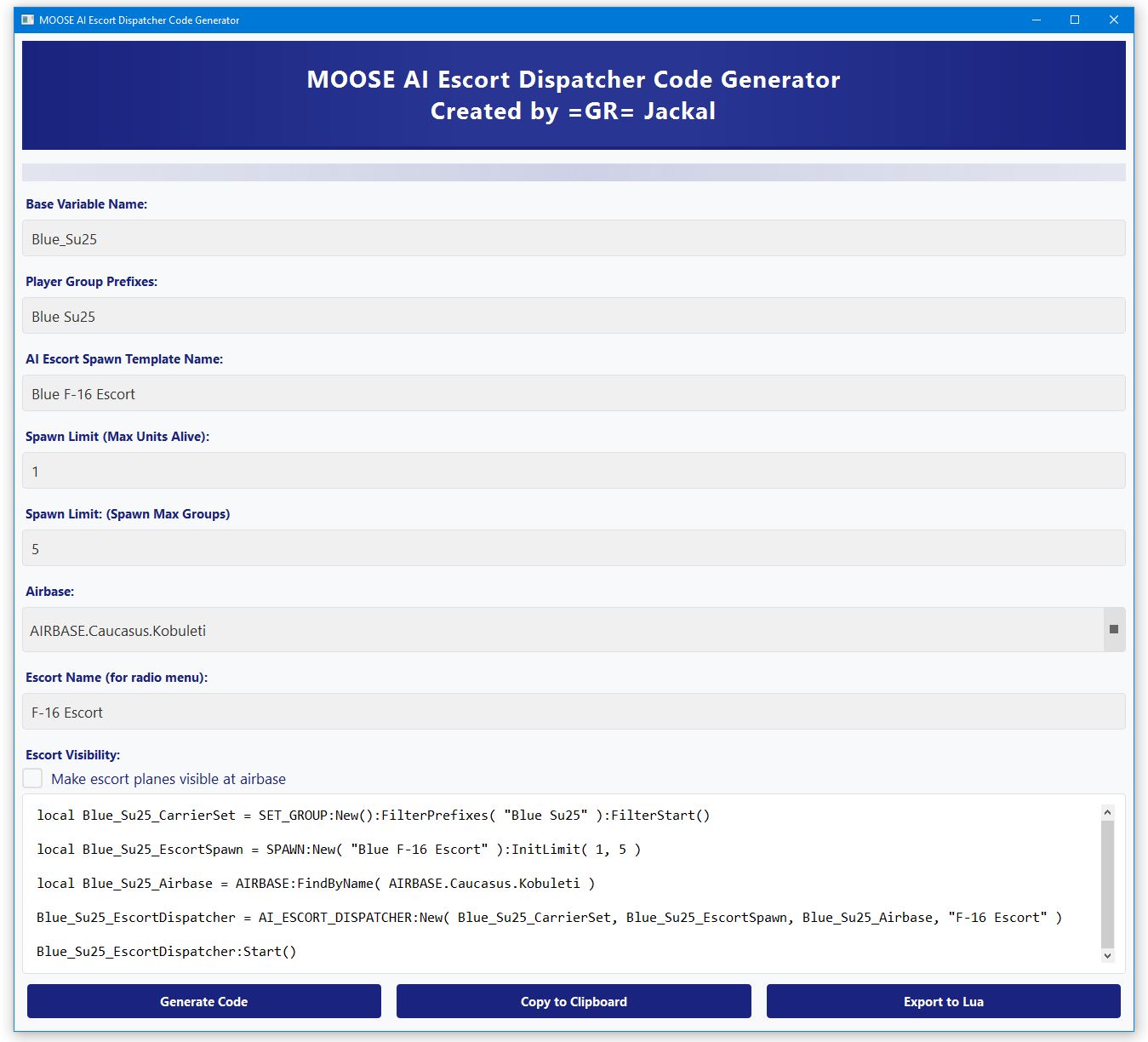 This simple program allows you to setup your MOOSE AI Escort Dispatcher and provide AI Escort flights to players in your missions, without having to code in Lua. The program generates the Lua code itself based on the user's inputs.