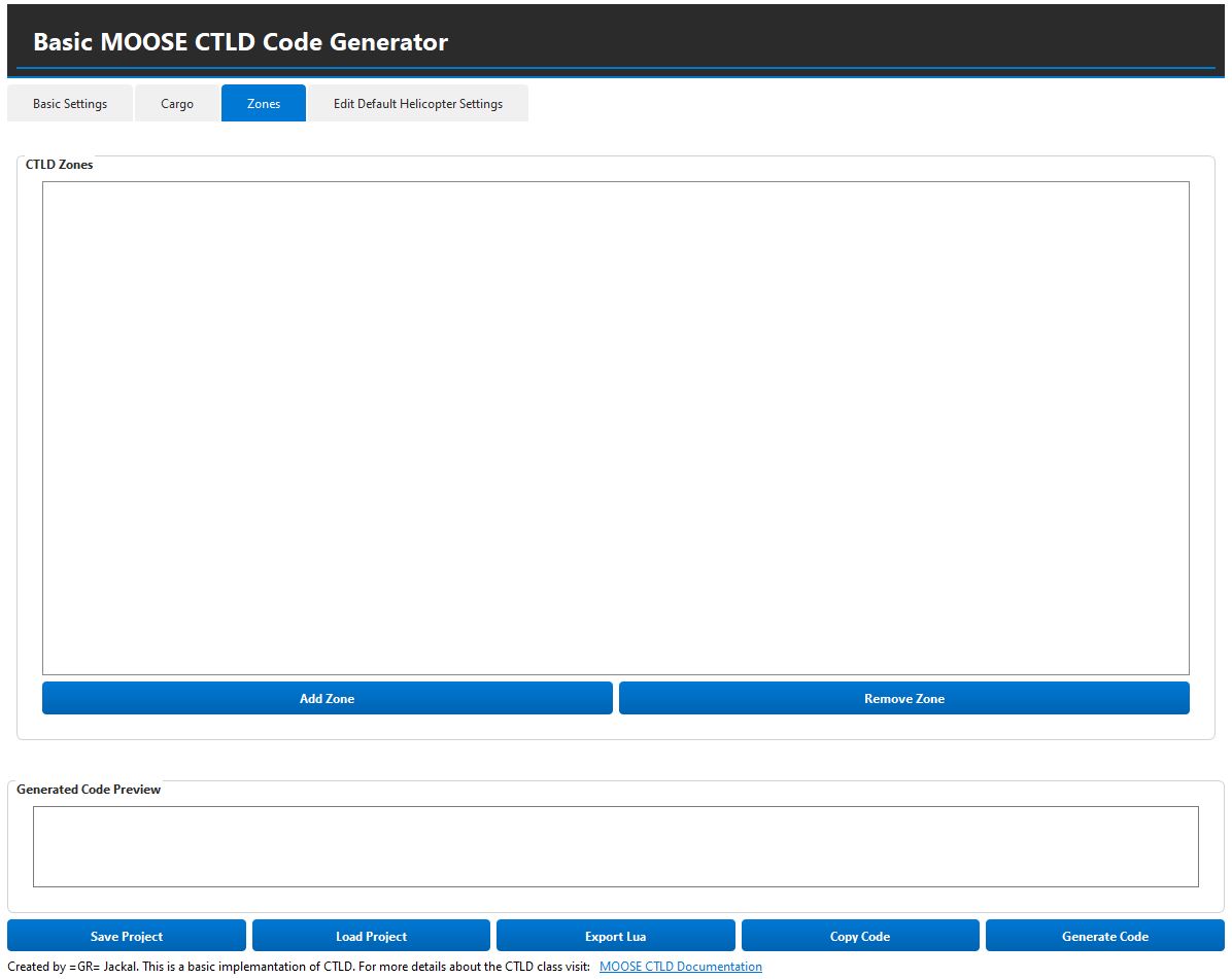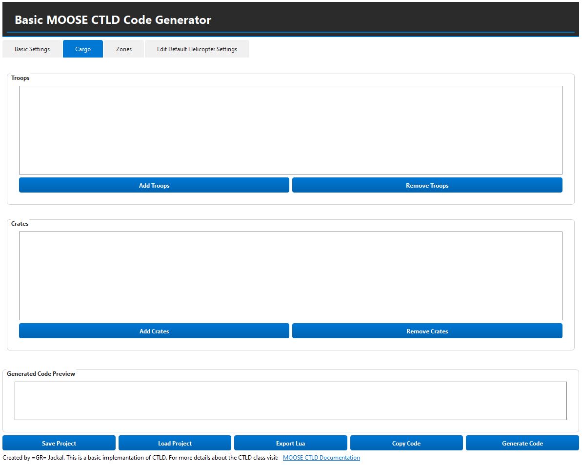 This program allows users to setup their MOOSE CTLD class for their missions without having to code in Lua. The program generates Lua code by itself, based on user’s inputs.