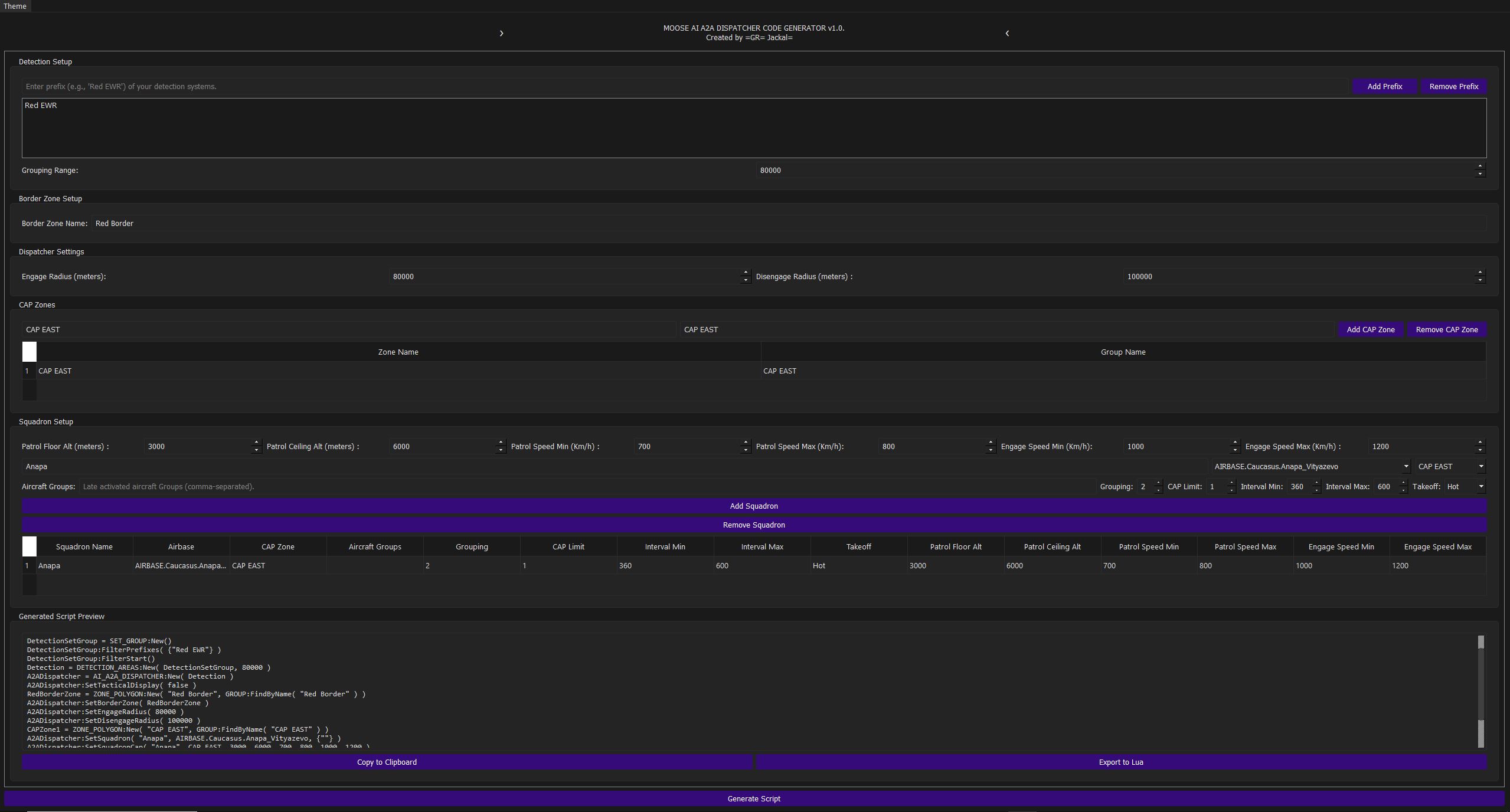 This programm allows you to setup your MOOSE AI A2A Dispatcher without having to code in Lua. The program generates the Lua code itself based on the user's inputs.