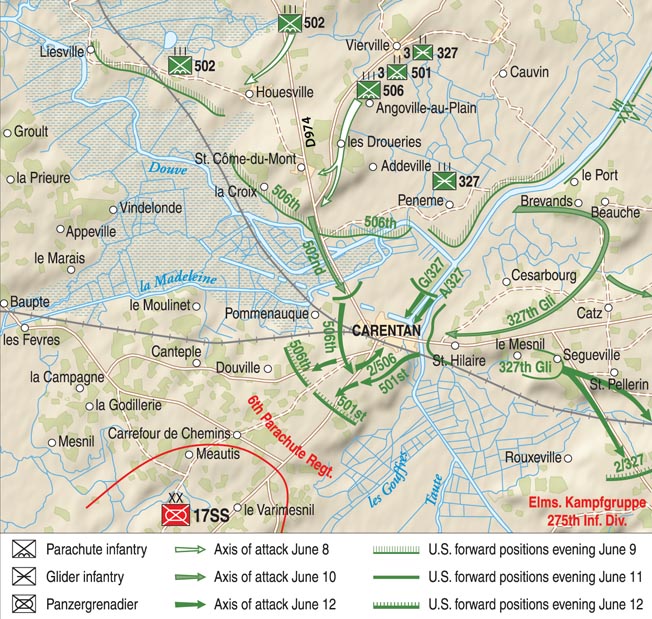 It is 12 June 1944. The 101st Airborne Division  has taken Carentan (see HBO's "Band of Brothers") and the ground forces from Utah and Omaha beaches are now linked after six days ashore.