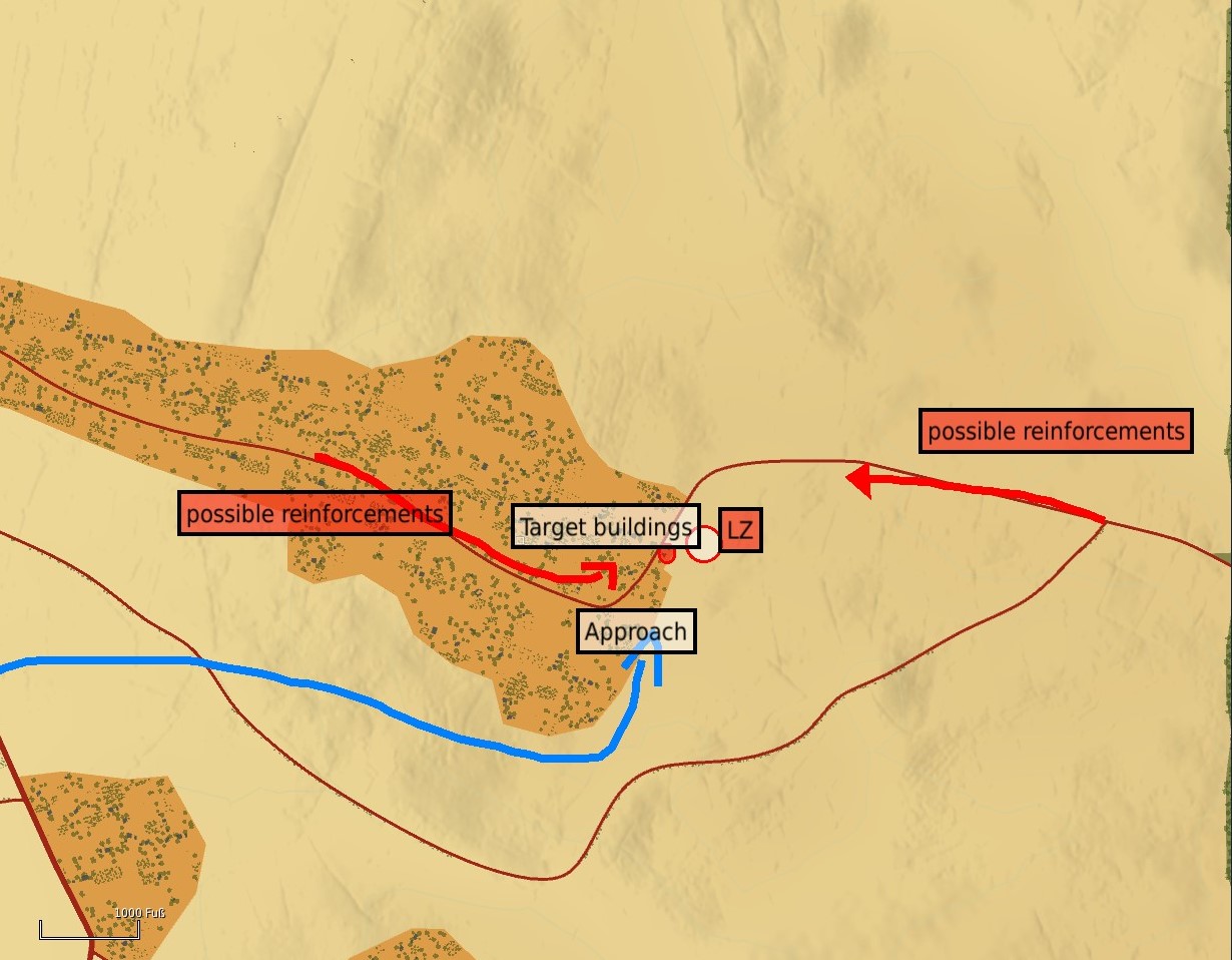 Take off immediately after you deployed the door-kickers, and observe the road marked as approach route of possible enemy reaction forces. You are free to engage any vehicles or armed individuals approaching the area.