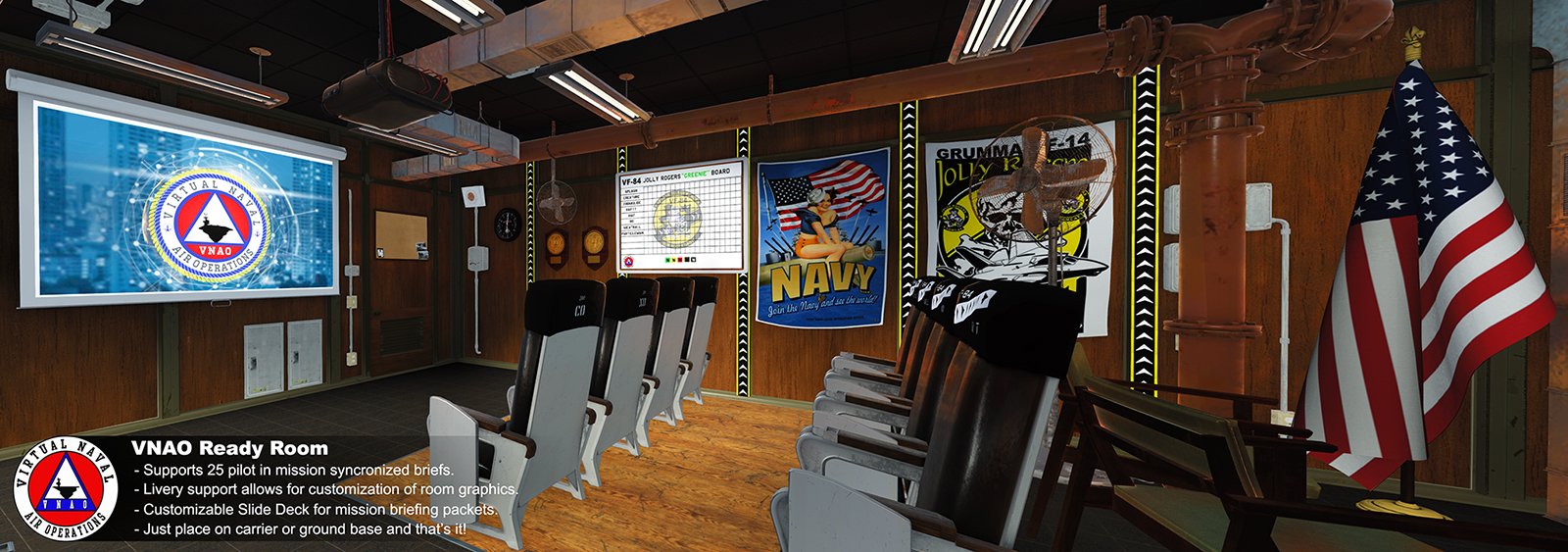 We wanted to create a space where aviators could take part in briefings while all in the same environment aboard an aircraft carrier. The VNAO Ready Room features currently include: