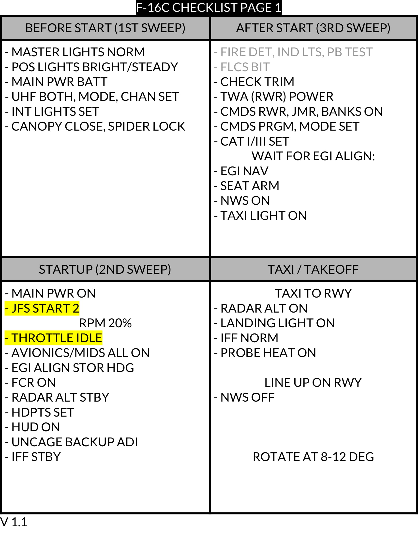 Inspired by Sydy's checklists in style and function. Information has been sourced from Sydy's checklist and various Falcon BMS manuals, with modifications and optimizations by me. Fairly WIP, still needs testing. Suggest any improvements in the comments.