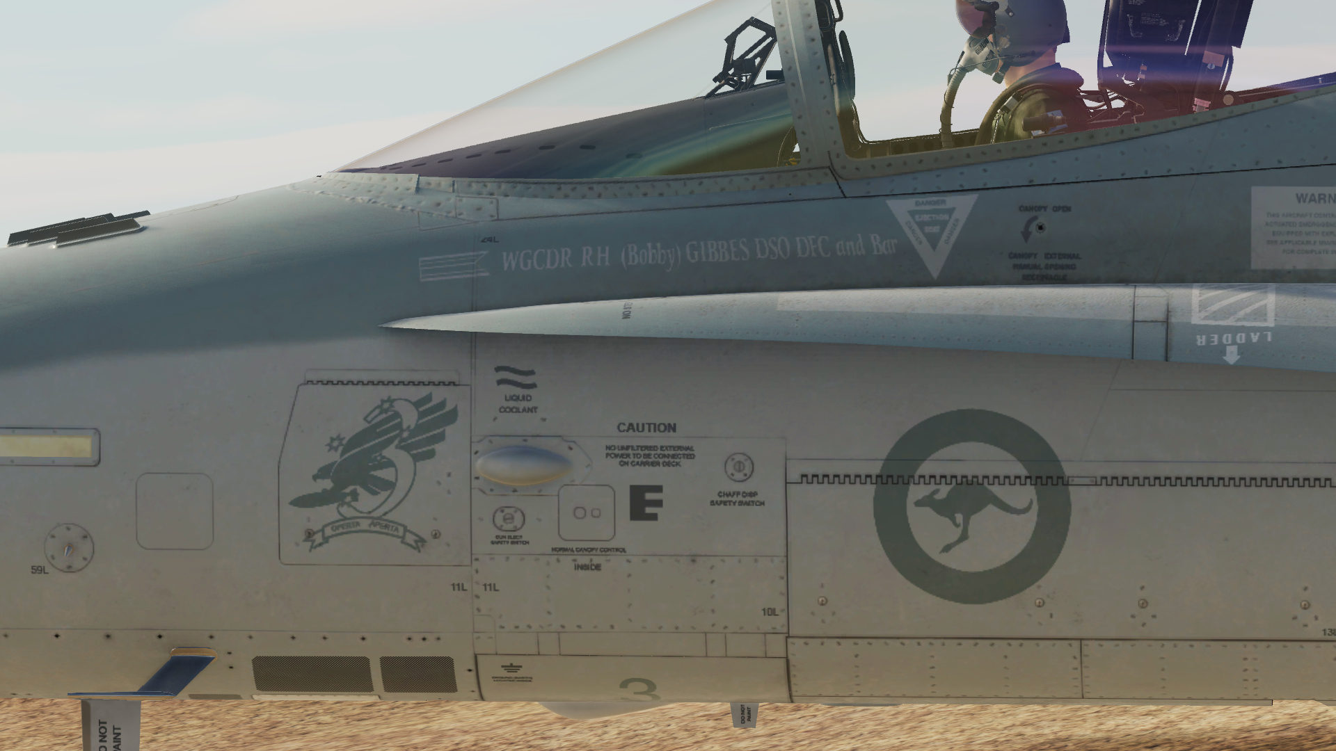 It has: Unique nose and tail art that had to be redone by hand as well as the Wing Commander's name under the canopy (screenshots 2 and 3), appropriate warning labels and all of the corresponding markings that this aircraft had at the moment that the reference images were taken (August 2013).