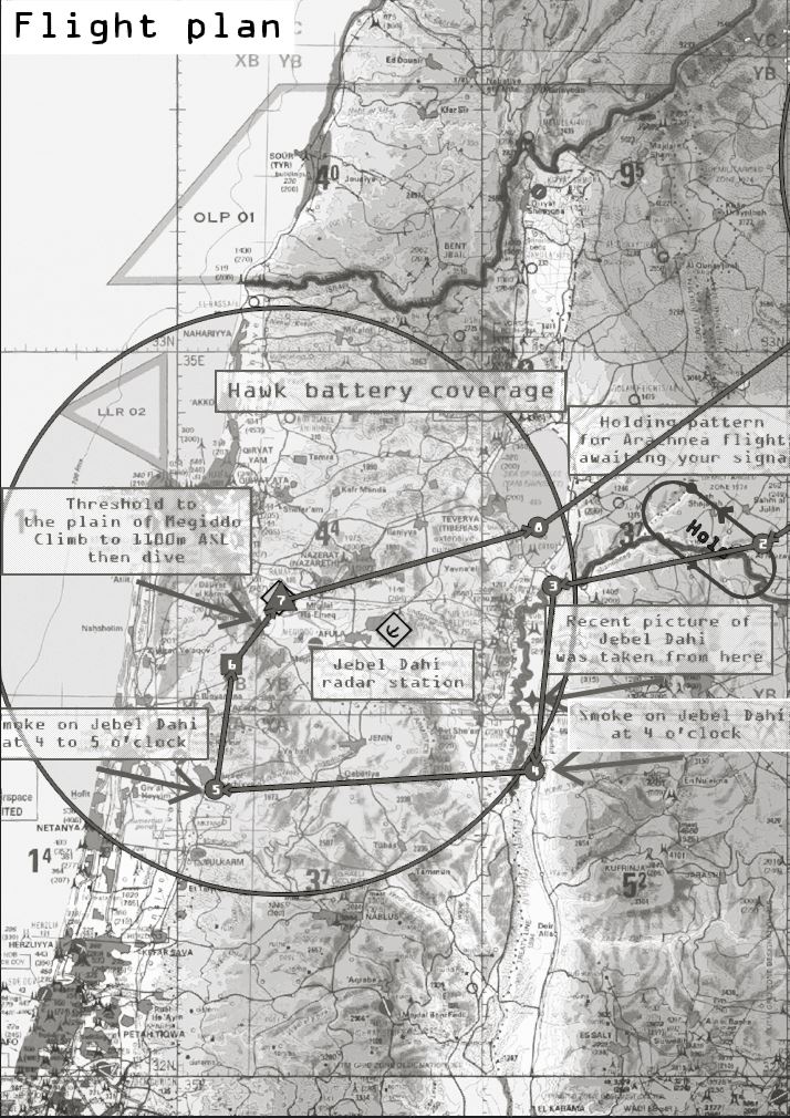 Your MiG-19 is tasked with sneaking into Israel using the hilly terrain to the south of Ramat David AB as cover. This will allow you to approach the Hawk battery site without being fired upon. The heavy smoke coming out of Jebel Dahi is highly visible. It will allow you to find your way deep into the enemy territory.
