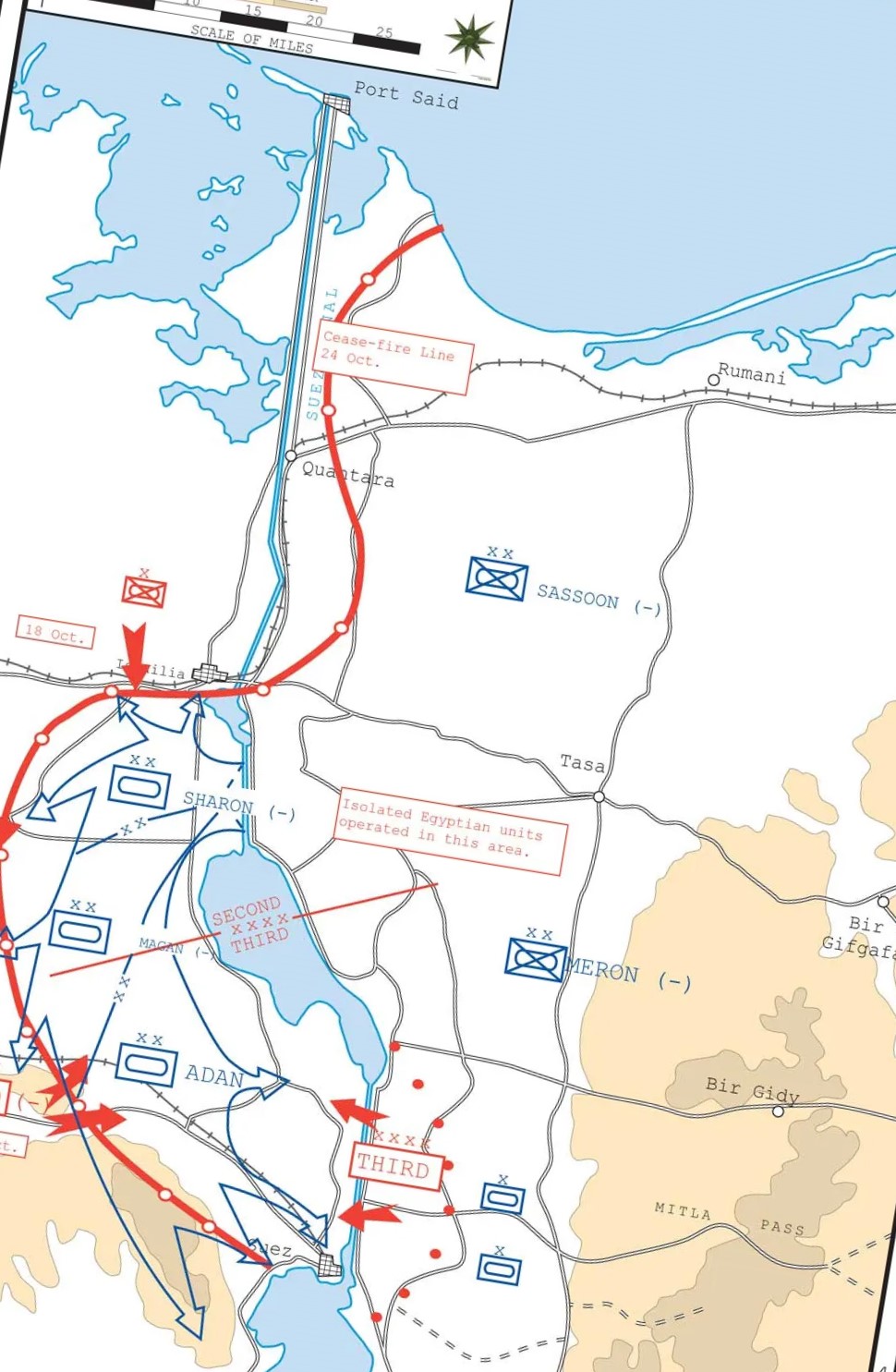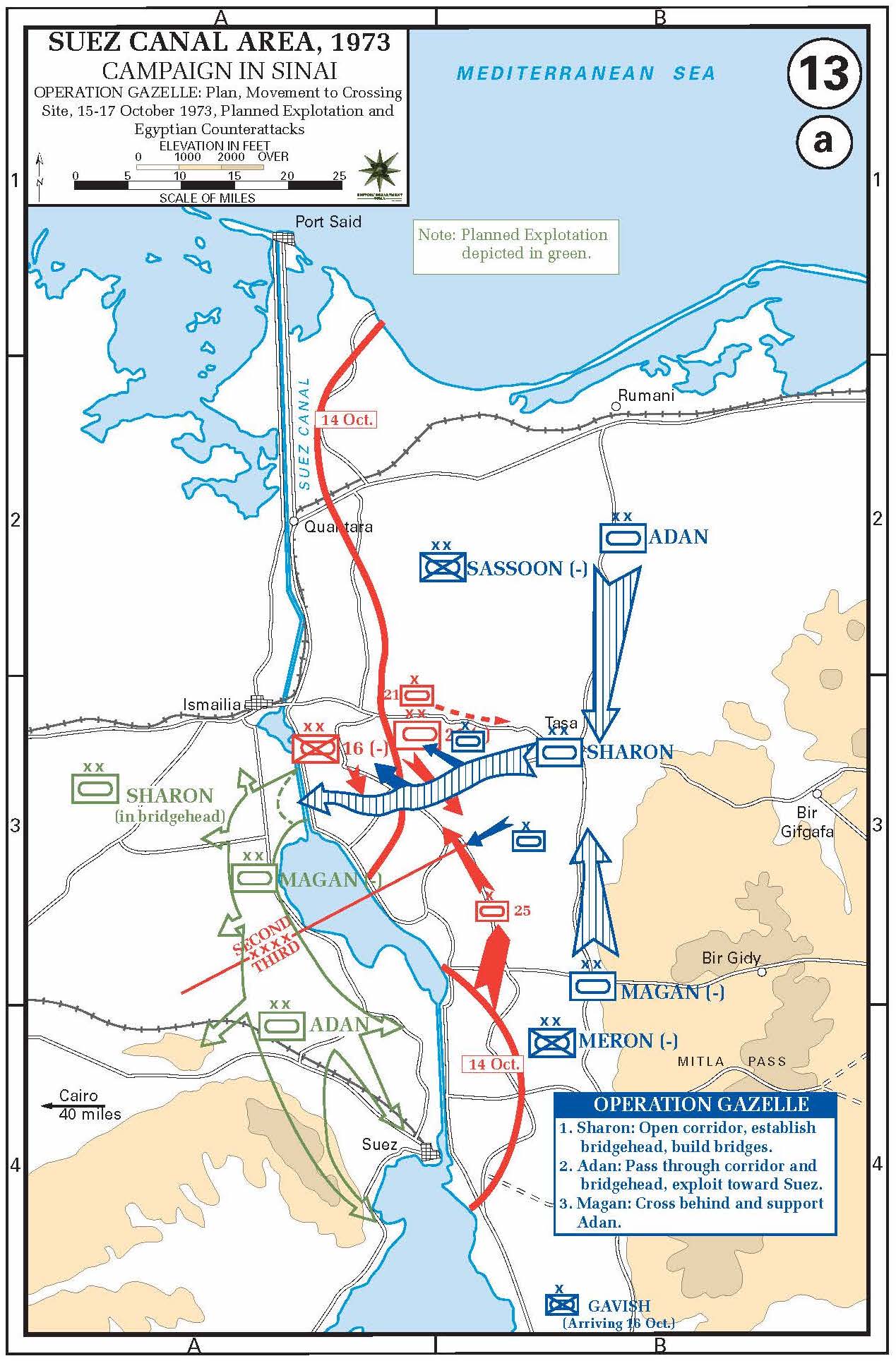 On 20 October 1973, Israeli armored forces that crossed the Suez Canal a day earlier today are advancing on the major Egyptian base at Fayid. A helicopter-borne IDF paratroop battalion was flying to the south of the base to engage any Egyptian ground vehicles trying to escape.
