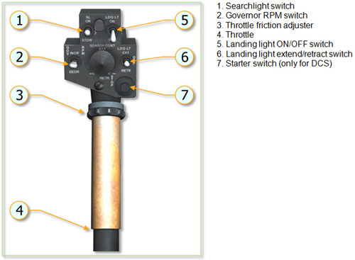 Der GOV-Schalter befindet sich auf der Triebwerk-Tafel (ENGINE). Die AUTO-Stellung erlaubt dem Drehzahlregler die automatische Drehzahleinstellung bei einem ganz aufgedrehten Gasgriff. Die EMER-Stellung erlaubt dem Piloten und Copiloten die manuelle Drehzahleinstellung. Da in der EMER-Stellung die automatische Drehzahlerhöhung, Verringerung und die Überdrehkontrolle ausgeschaltet sind, müssen in einem solchen Falle die Eingaben sehr vorsichtig ausgeführt werden. Ansonsten droht ein Kompressordruckabfall, Überdrehzahl, zu hohe Temperatur und letztendlich ein Triebwerksschaden.