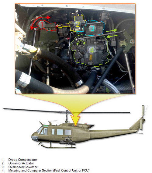 Der Drehzahlabfallkompensator hält die Turbinendrehzahl (N2) auf einem konstanten Niveau, falls der Pilot mehr Leistung abfragt. Der Kompensator ist durch eine Lenkstange mit dem Kollektivhebel und dem Geschwindigkeitswählregler am N2-Regler verbunden. Das System arbeitet automatisch und verlangt keinerlei Input von der Besatzung. Der Kompensator wird bei der korrekten Einstellung eine Drehzahl von 6600 RPM einhalten. Drehzahlabfall wird als eine Drehzahländerung des Triebwerkes bei einer Erhöhung der Leistung definiert. Die Drehzahlabfall-kompensation gehört zum grundlegenden Design des Triebwerksystems. Ohne diese würde sich bei einer Erhöhung der Triebwerksleistung eine charakteristische Instabilität entwickeln, die zu einer Überdrehzahl der N1-Drehzahl oder einer oszillierenden "Jagd" nach der richtigen Turbinendrehzahl führt.
