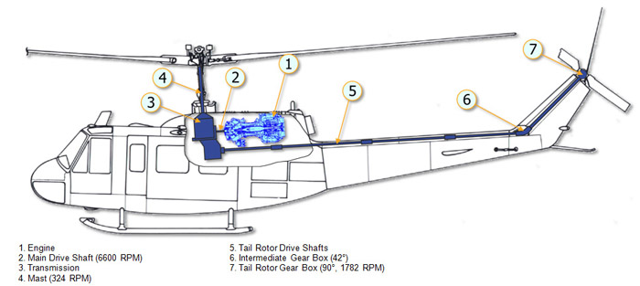 Das Hauptgetriebe ist direkt vor dem Triebwerk montiert und ist durch den Hauptantriebsstrang auf der "kalten" Seite des Triebwerks mit diesem verbunden. Das Hauptgetriebe ist im Grunde ein Reduktionsgetriebe, welches die Triebwerksdrehzahl verringert und an das Rotorsystem weitergibt. Eine Freilaufnabe ist im Hauptgetriebe verbaut. Diese sorgt dafür, dass sich der Rotor selbst dann weiterdrehen kann, wenn die Triebwerksleistung nicht mehr zur Verfügung steht. Dies erlaubt dem Piloten, eine Notfalllandung unter Ausnutzung der Autorotation durchführen zu können. Der Antriebsstrang für den Heckrotor ist im unteren, hinteren Bereich des Hauptgetriebes angebracht. Der Antriebsstrang des Heckrotors besteht aus mehreren Heckrotorwellen und Getrieben. Der Rotordrehzahlgenerator, die hydraulische Pumpe und der Hauptgleichstromgenerator sind am Getriebe angeschlossen und werden hier angetrieben. Ein geschlossenes Öldrucksystem ist im Hauptgetriebe verbaut.
