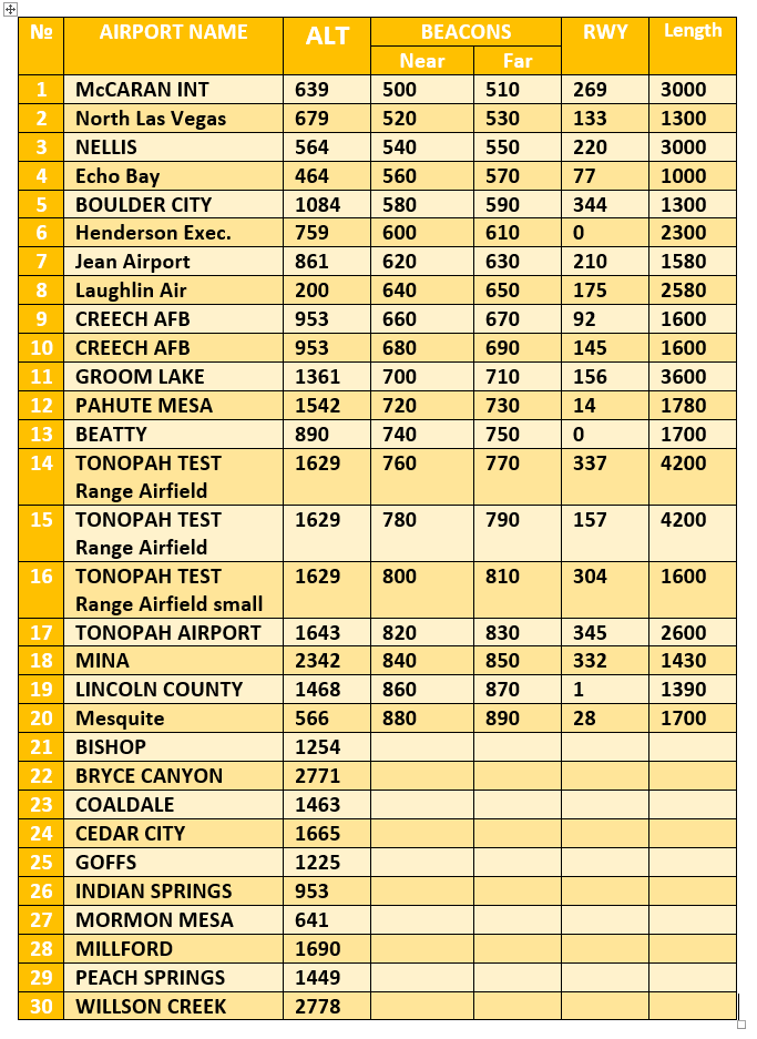 Шаблон карты Невада версии 2.0.4, в который внесены ДПРМ и БПРМ (в пятой ревизии ДОТы заменены на тригерные зоны) на все существующие аэродромы. "Найдена" ещё одна ВПП. На каждом ВПП стоит по два "маяка" ДПРМ "тире" на удалении 10 км и БПРМ "точка - тире" на удалении 5км. Скриншоты из прошлой ревизии следует удалить, а вставить в планшет новую таблицу.