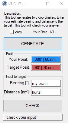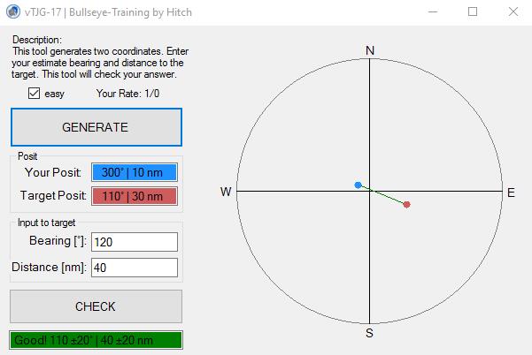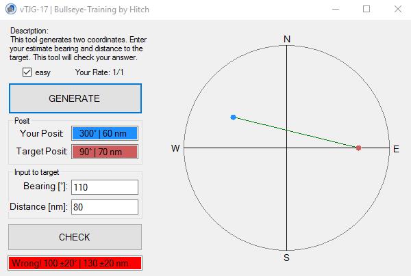 This tool generates two coordinates by using a reference point (bullseye). Try to enter the correct bearing and distance and check your answer.