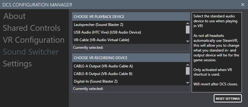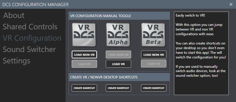 The DCS Configuration Manager was created to make the tough DCS life a little easier and help you with those pesky configuration files! The goal was to make you interact with the app itself as little as possible, as noone likes more overhead before you can go fly your sortie! Use it once, set everything up - done!