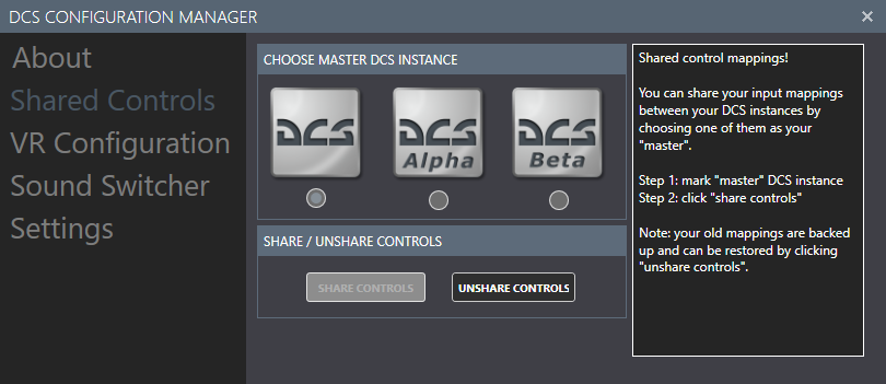 Links your control settings of all your DCS instances to just one. No more import/export when you changed your mappings and switch from 1.5 to 2.0! (or to beta, or any direction really).