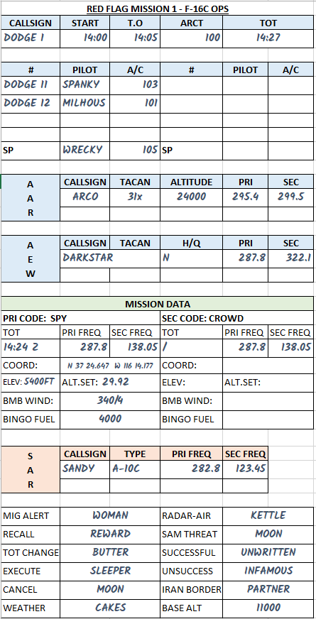 Blue forces will have AWACS, tanker and jamming support on this mission, which will be orbiting to the East.