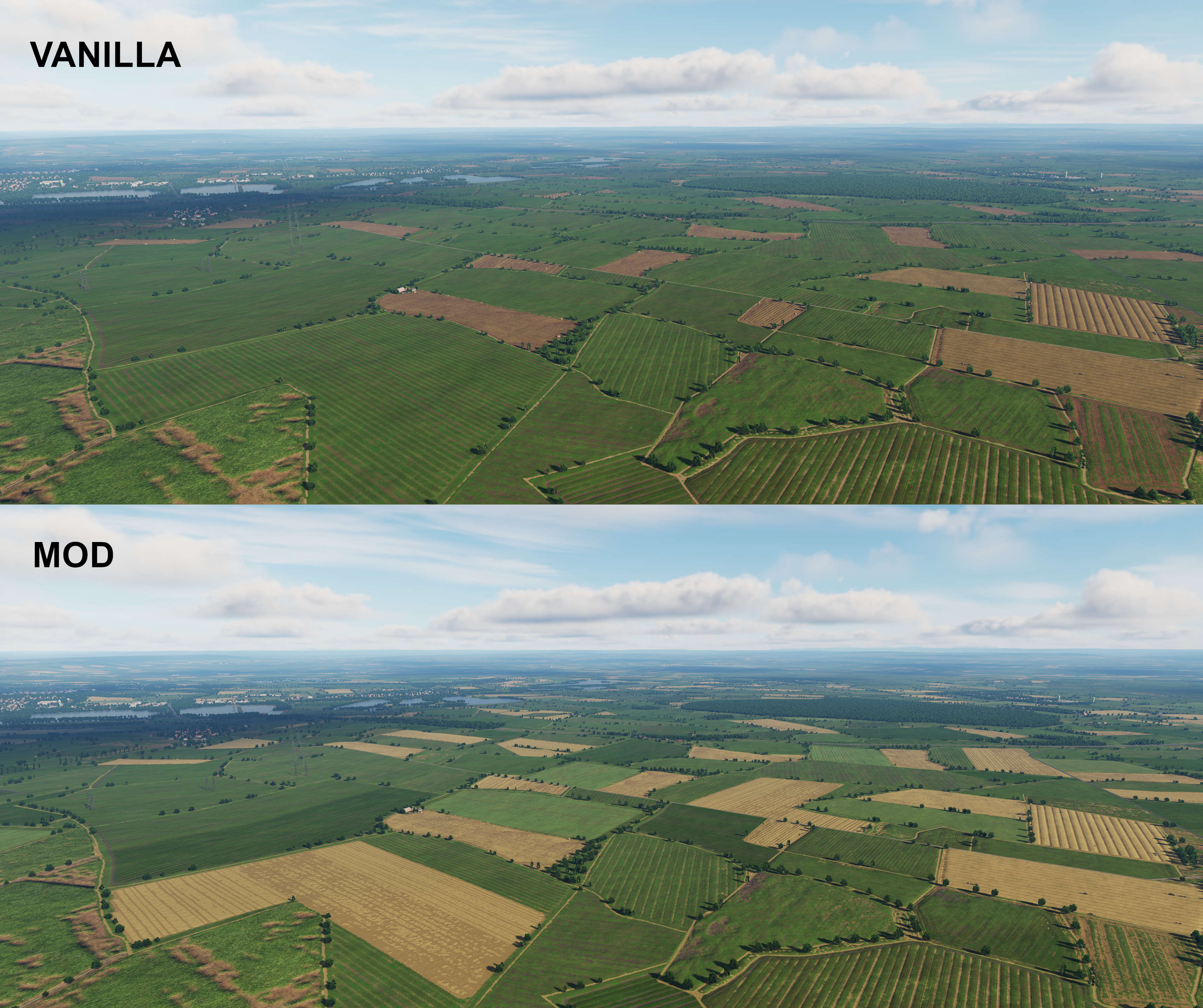 I've added several new textures of fields (including normal maps) and further edited some existing ones, overall the map will be populated with more wheat fields. Some of the green textures has been darkened or brightened to add more variety and make the map look closer to the satellite picture base texture, that has more varying shades of green.