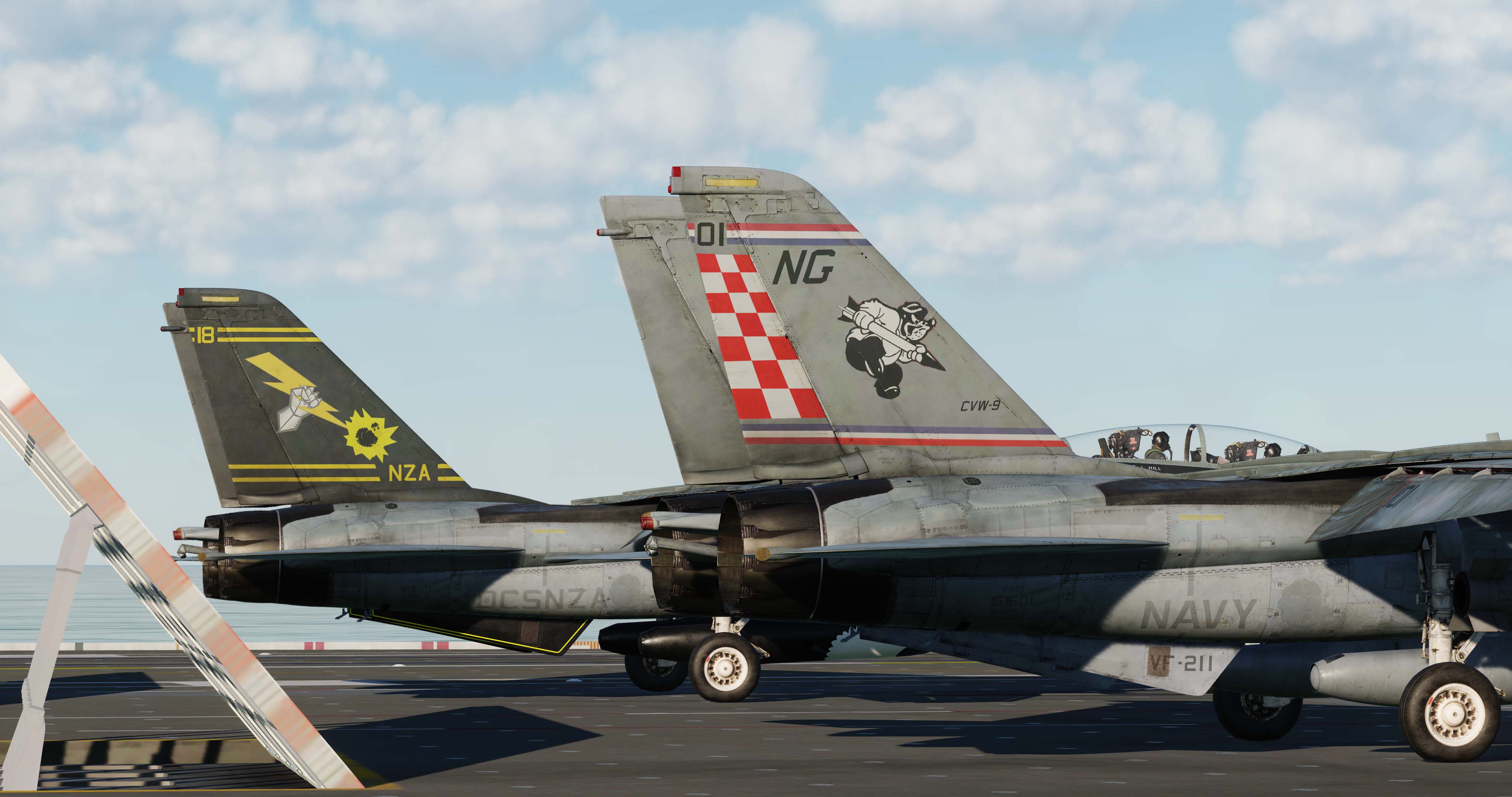 When CDR Dave 'Bio" Baranek became CO of VF-211 he ordered a repaint of his aircraft '101'. This is a re-creation with his blessing as made for the DCSNZA and Bio live stream. This paint scheme was on the outside of the lead aircraft during the live stream. An adjustment was made since some of these screens to replace the pilots' helmet from the one in the Livestream and replaced the name on the canopy with one of the Commanders in VF-211 with Dave, Cdr Mark 'Coconut' Kohart.