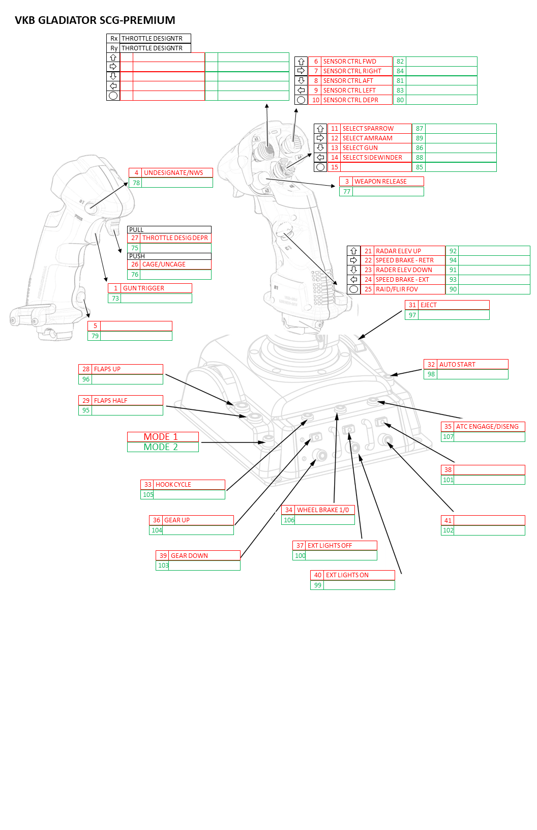 This is a profile and mapping document (PowerPoint) for the VKB Gladiator with the SCG-Premium grip. Note that this is using the MODE button to switch between two modes on the Gladiator, which requires the appropriate VKB profile (included).