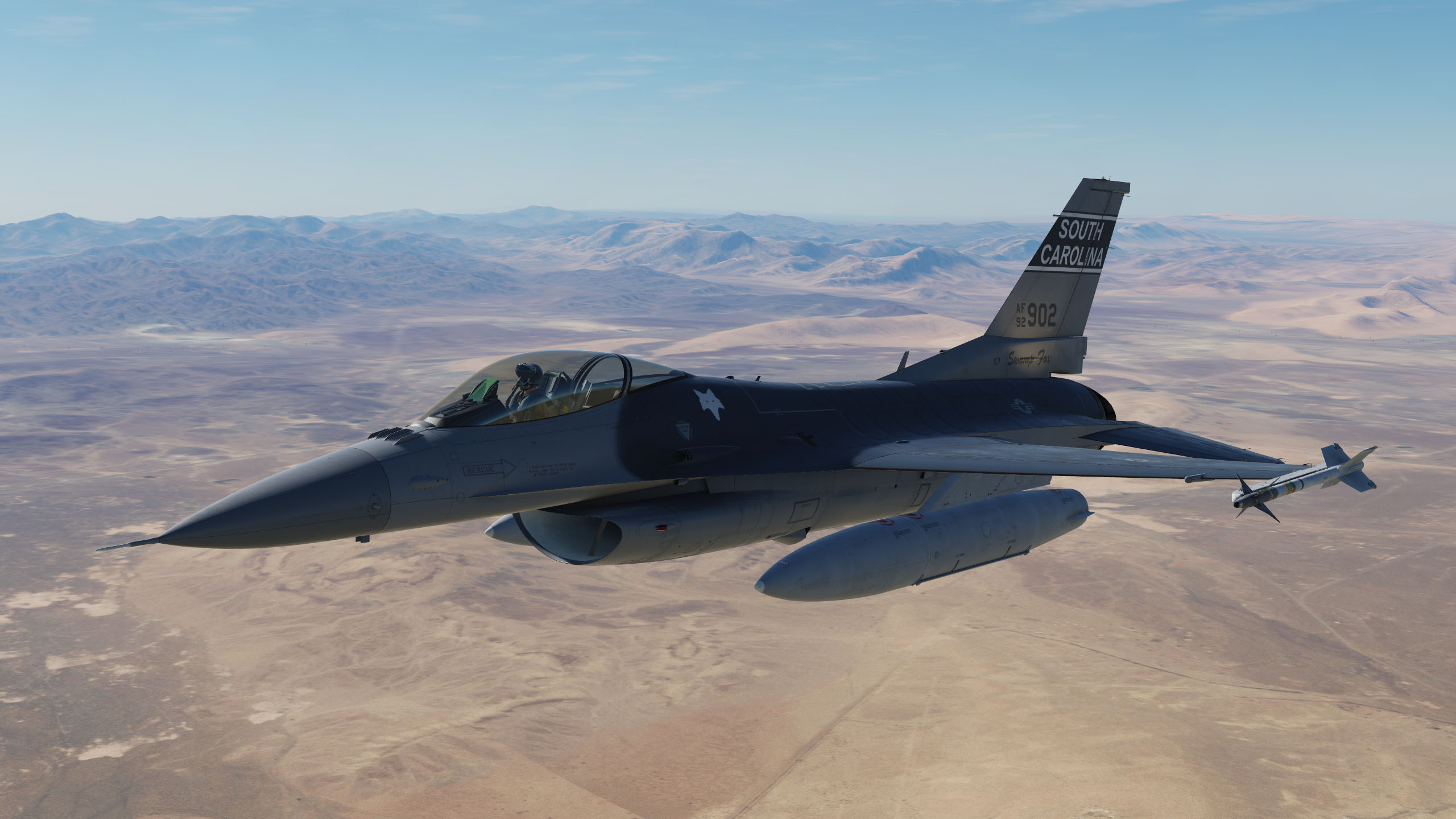 This livery depicts the SC Air National Guard's 157th FS circa 2003 during Operation Iraqi Freedom.  The packaged skin is setup for any tail number staring with AF 92.  The textures are included to do AF 91, AF 92, and AF 93 aircraft which covers all the aircraft that served in 2003 OIF.  You will have to point the LUA file at the appropriate texture should you choose to deviate from any AF 92 aircraft.  Features: (1) Swamp Fox unit markings (tail marking, fox heads, etc.);  (2) Custom bort numbers to support AF 91, AF 92, and AF 93 series airframes;  (3) Black turkey feathers to look more carbon fiber; (4) Matching pylon and fuel tank textures; (5) Pilot has coyote brown flight suit that is worn during desert deployments;  (6) The skin is much cleaner (less dirty) than the default SW livery.