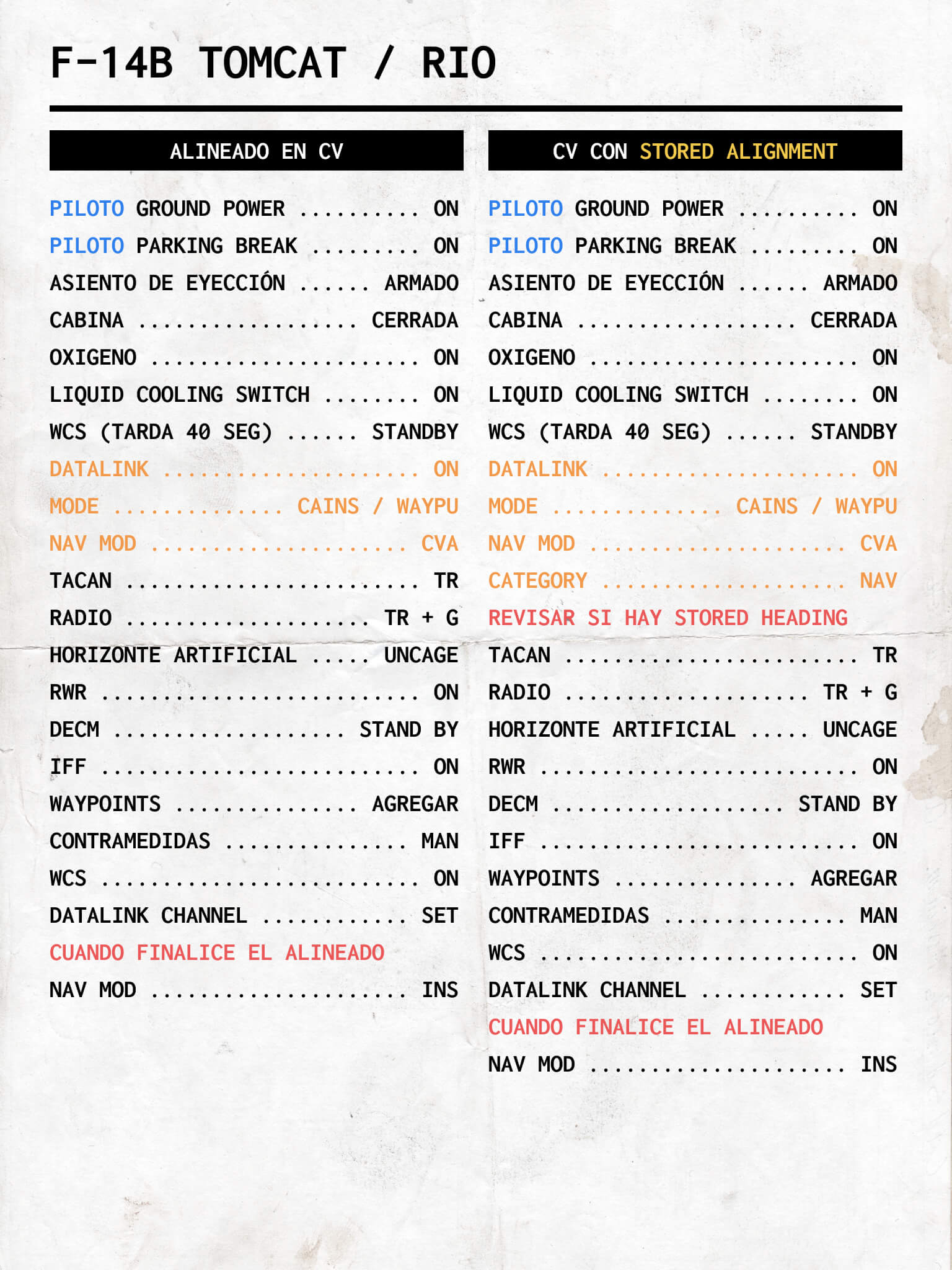 Pack de 4 checklist para el F-14B. Checklist de Arranque para piloto y para RIO, Taxi, Despegue y Case III