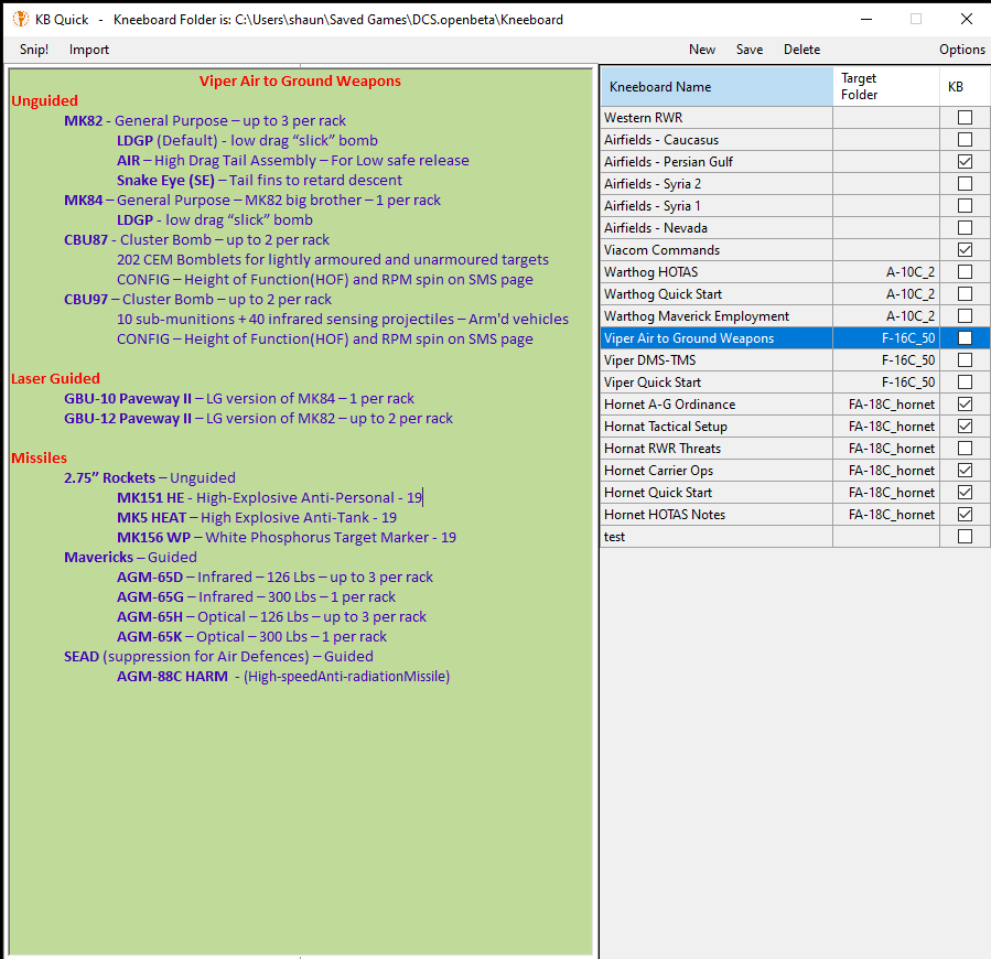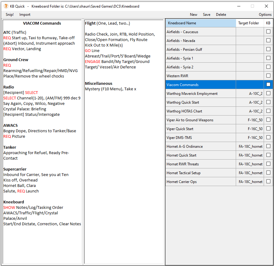 • Kneeboards are managed as .rtf files and can be quickly selected and re-edited
