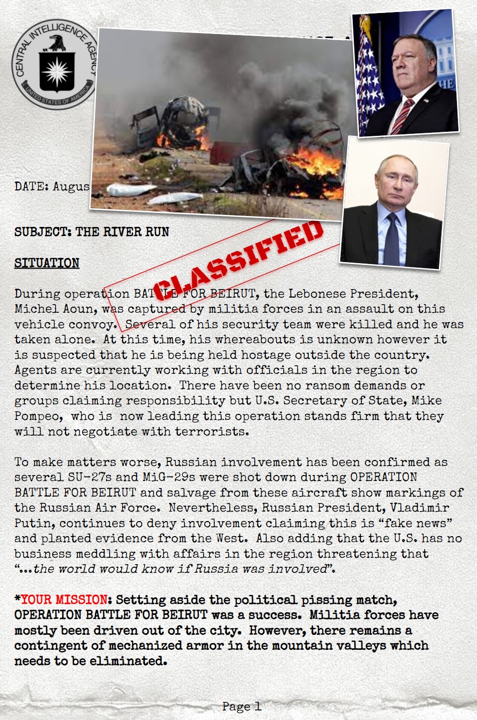 During operation BATTLE FOR BEIRUT, the Lebonese President, Michel Aoun, was captured by militia forces in an assault on this vehicle convoy. Several of his security team were killed and he was taken alone. At this time, his whereabouts is unknown however it is suspected that he is being held hostage outside the country. Agents are currently working with officials in the region to determine his location. There have been no ransom demands or groups claiming responsibility but U.S. Secretary of State, Mike Pompeo, who is now leading this operation stands firm that they will not negotiate with terrorists.