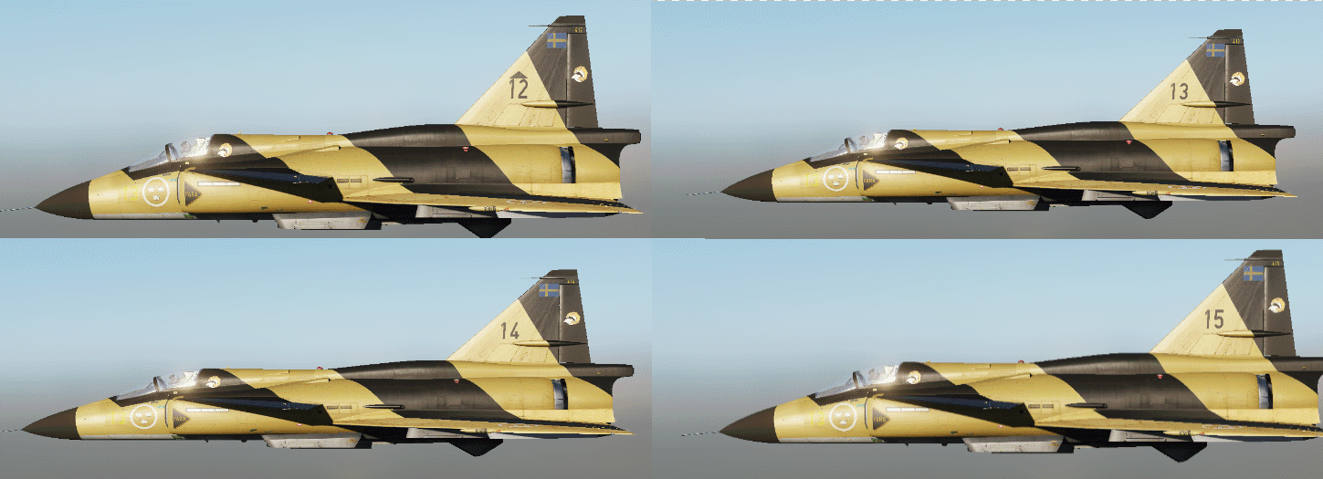 A quick made skin based on another skin for the Viggen. Tan/Black stripes with dark gray belly (includes 4 different tailnumbers)