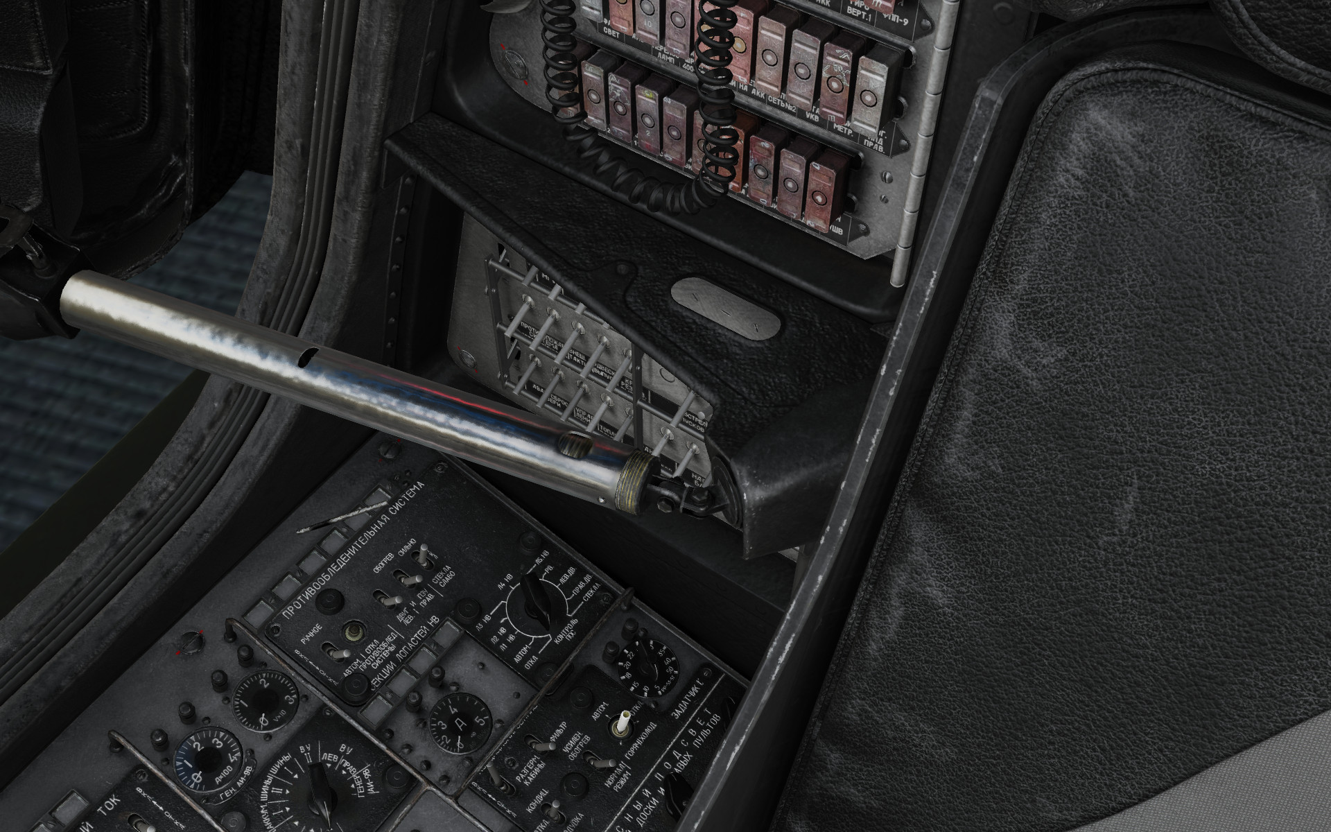 Repainted original cockpit textures for the Mi-24P module, representing grey, Russian-language cockpit. Original textures were re-colored to represent fictional cockpit painted in westers style grey color. Some textures are in original resolution, others, resized, to take up less VRAM space - this was optimized to not affect visual quality, yet resulted in reduction of roughly 50% of needed video memory for all used cockpit textures. Performance increase may be noticed on video cards with limited VRAM space.