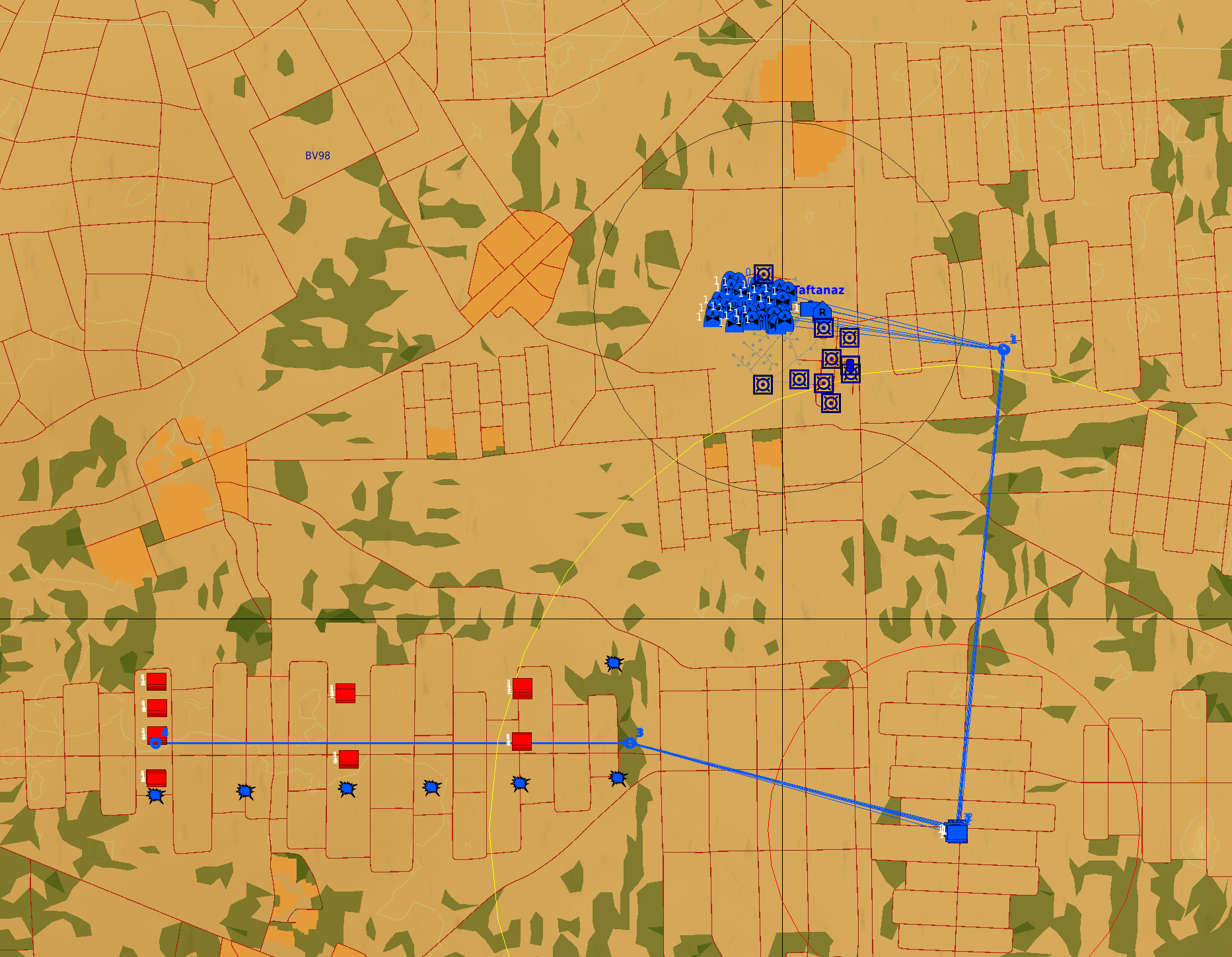 The large live fire training area is to the south west of Taftanaz helicopter base.  The units will move if damaged (as all AI do), but can not fire back and with the 1km intervals marked with smoke it makes learning a proper sight picture at set ranges fairly straight forward.  There is also a working road base farp to the west of the targeting range for those who wish to practice take offs and landings at, or to rearm without flying back to Taftanaz.