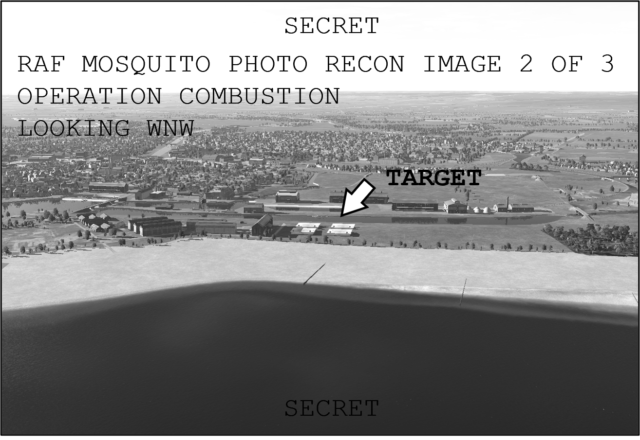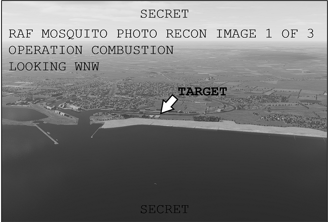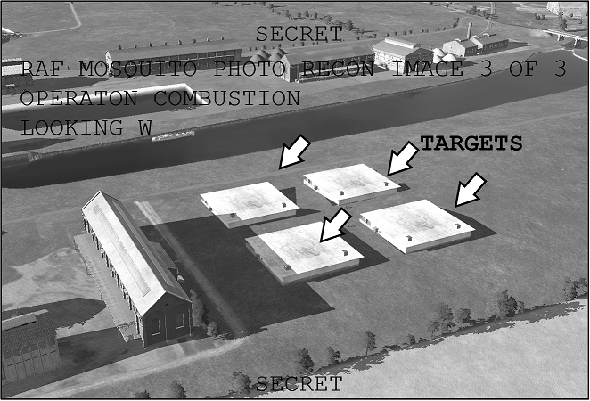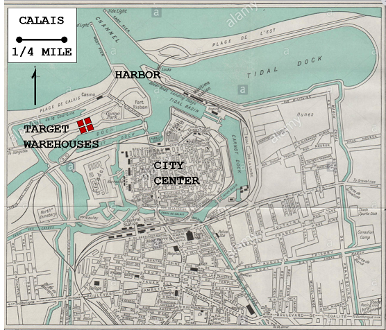 Your mission is to destroy V-1 components in one or more  target warehouses in Calais.  These distinctive large square buildings are marked on the attached map and visible in the attached recon photos from the RAF.  We don't know which warehouse(s) contain the V-1s so watch for secondary explosions.
