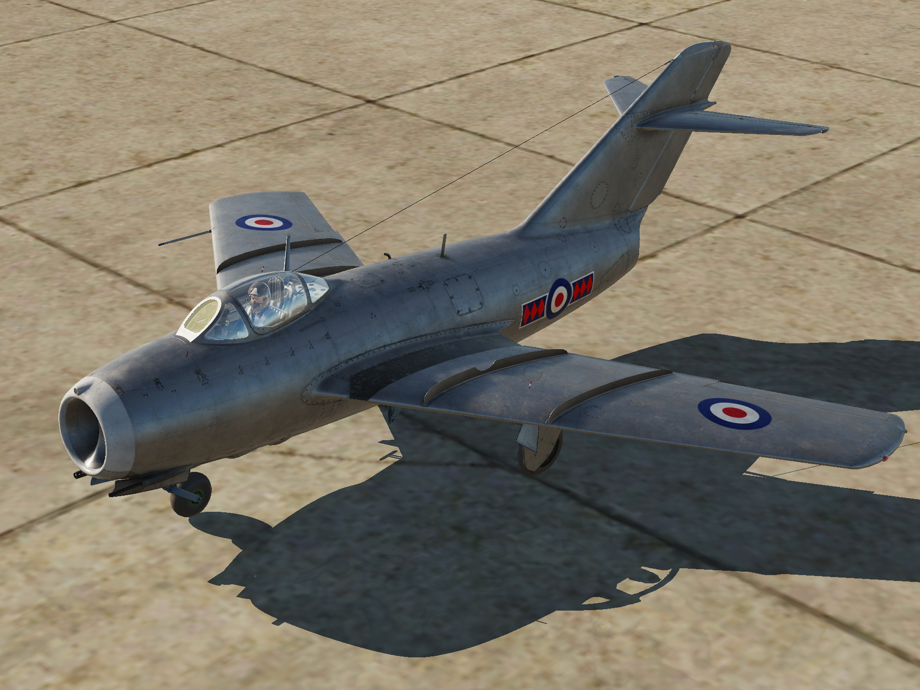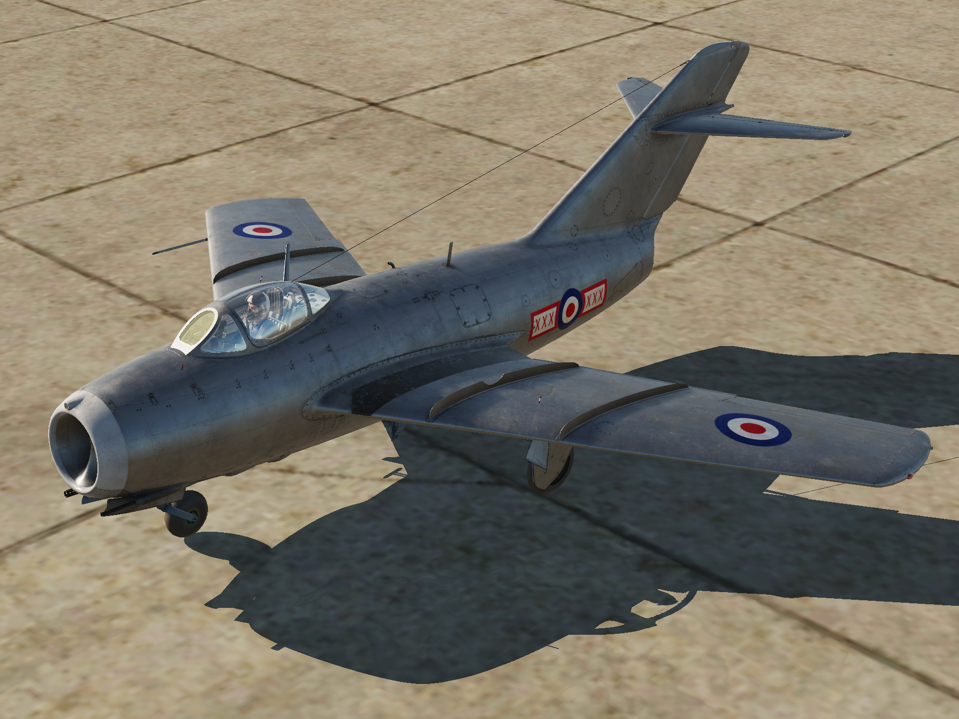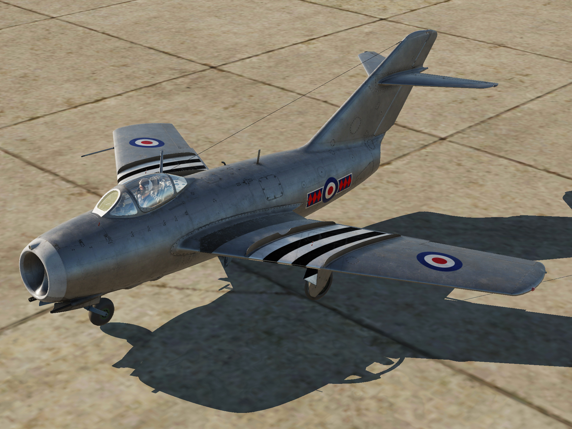 Fictional interpretation of a MiG-15Bis in the livery of two RAF Squadrons (45 Sqn and 29 Sqn) with and without invasion stripes.