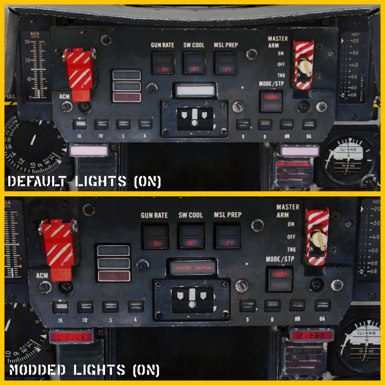 I've been bothered with not being able to tell if the master caution and left fire or right fire lights were illuminated or not, because either way they were too whitewashed to tell.