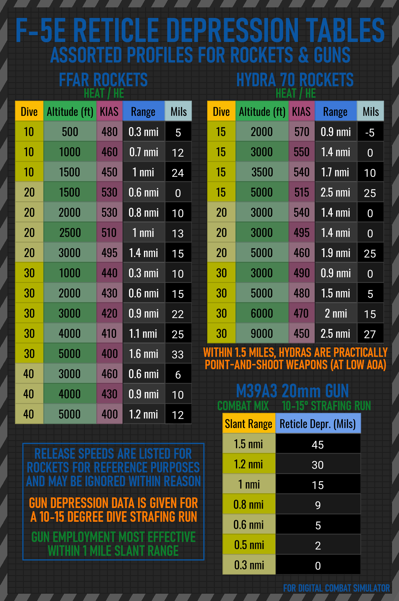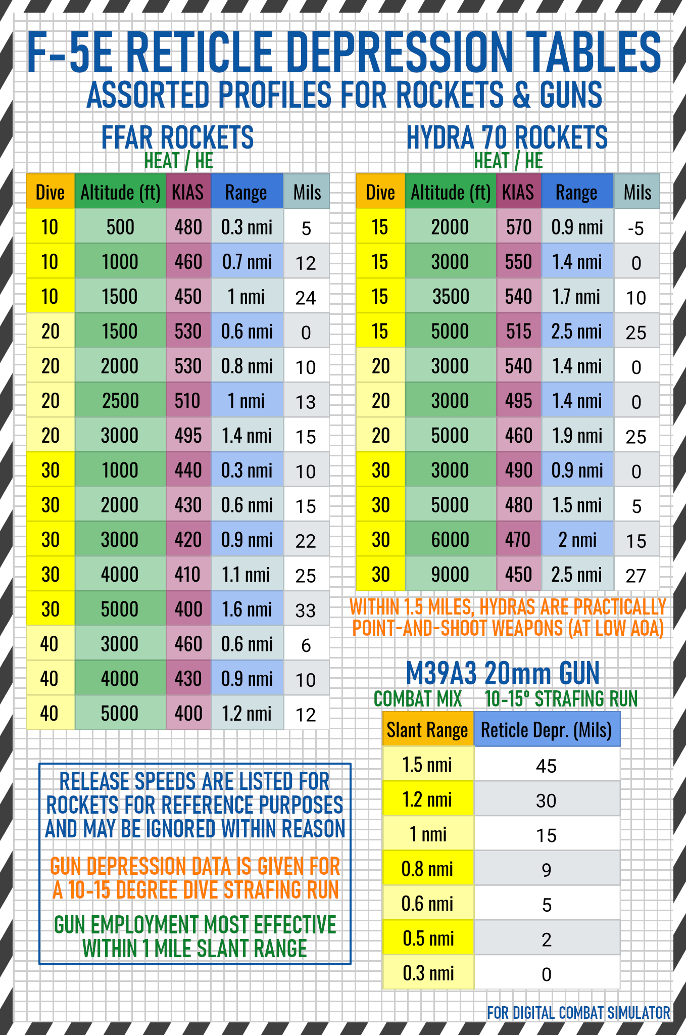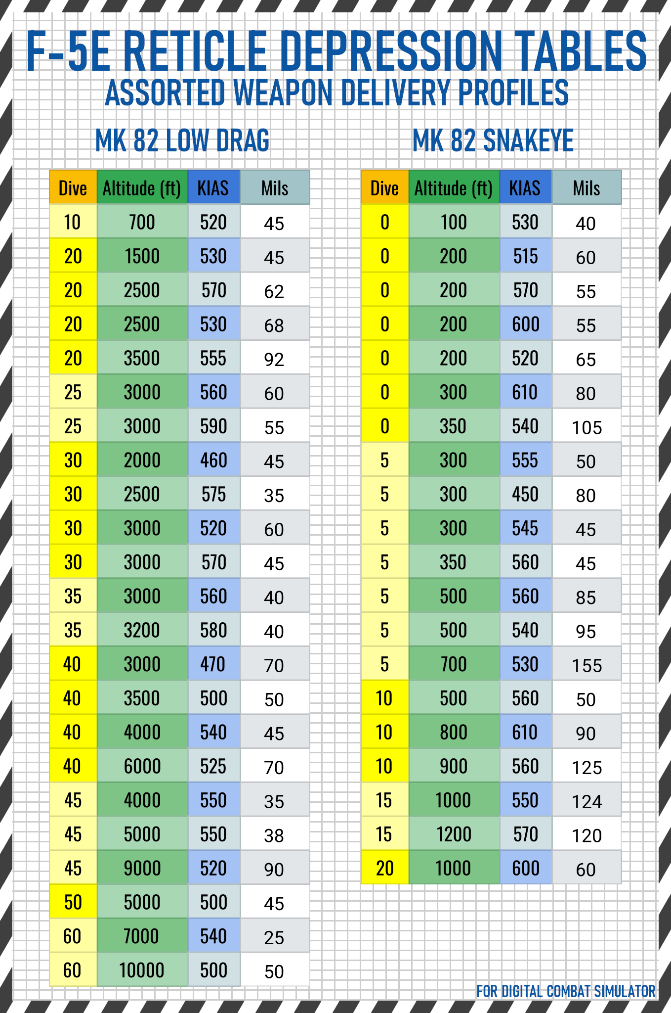 A pocket-sized 7-page bombing table for most air-to-ground weapons carried by the F-5E-3 in DCS, built via in-game testing. Large font size to accommodate users with smaller screens. Comes in day and night versions.