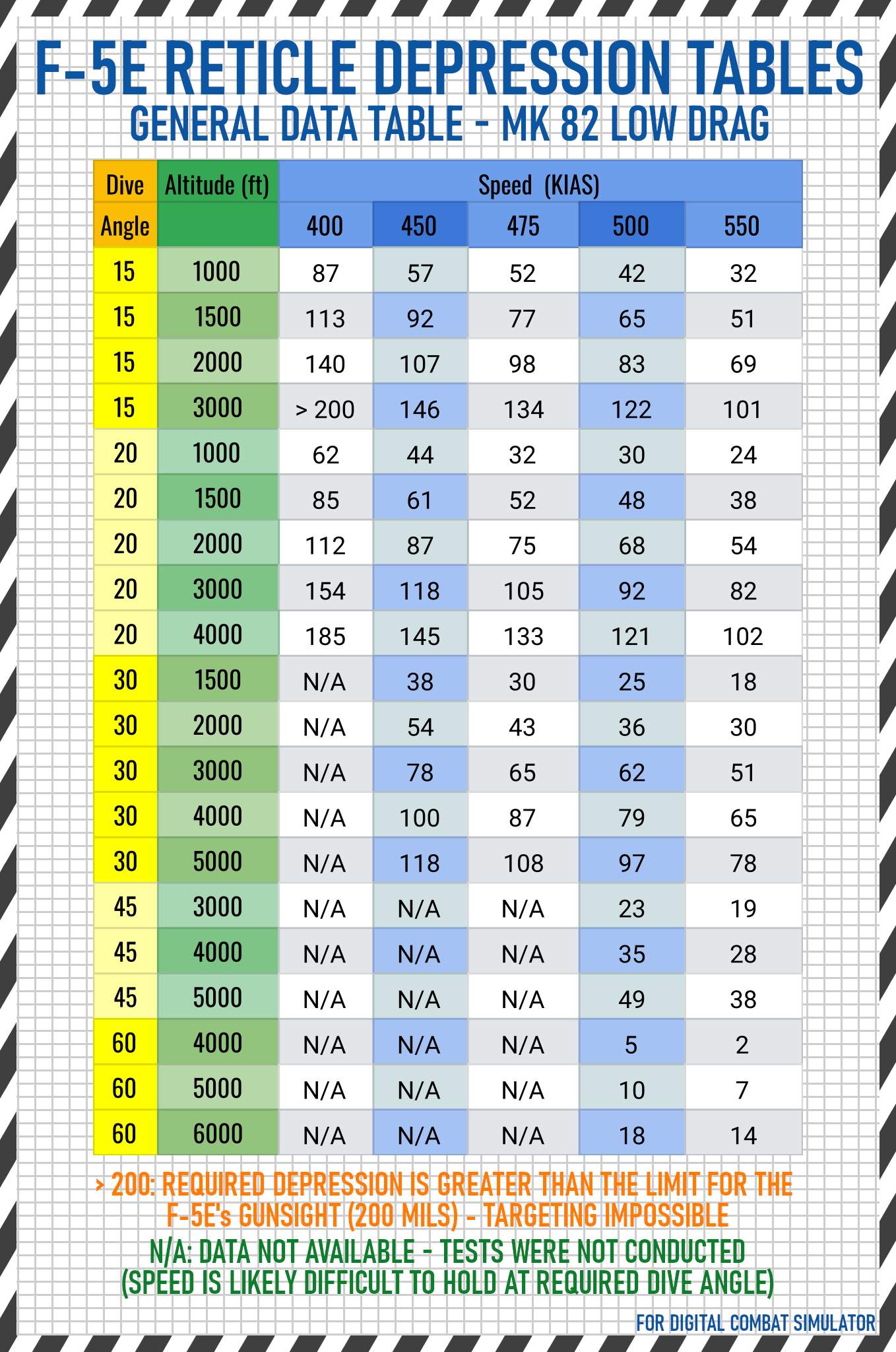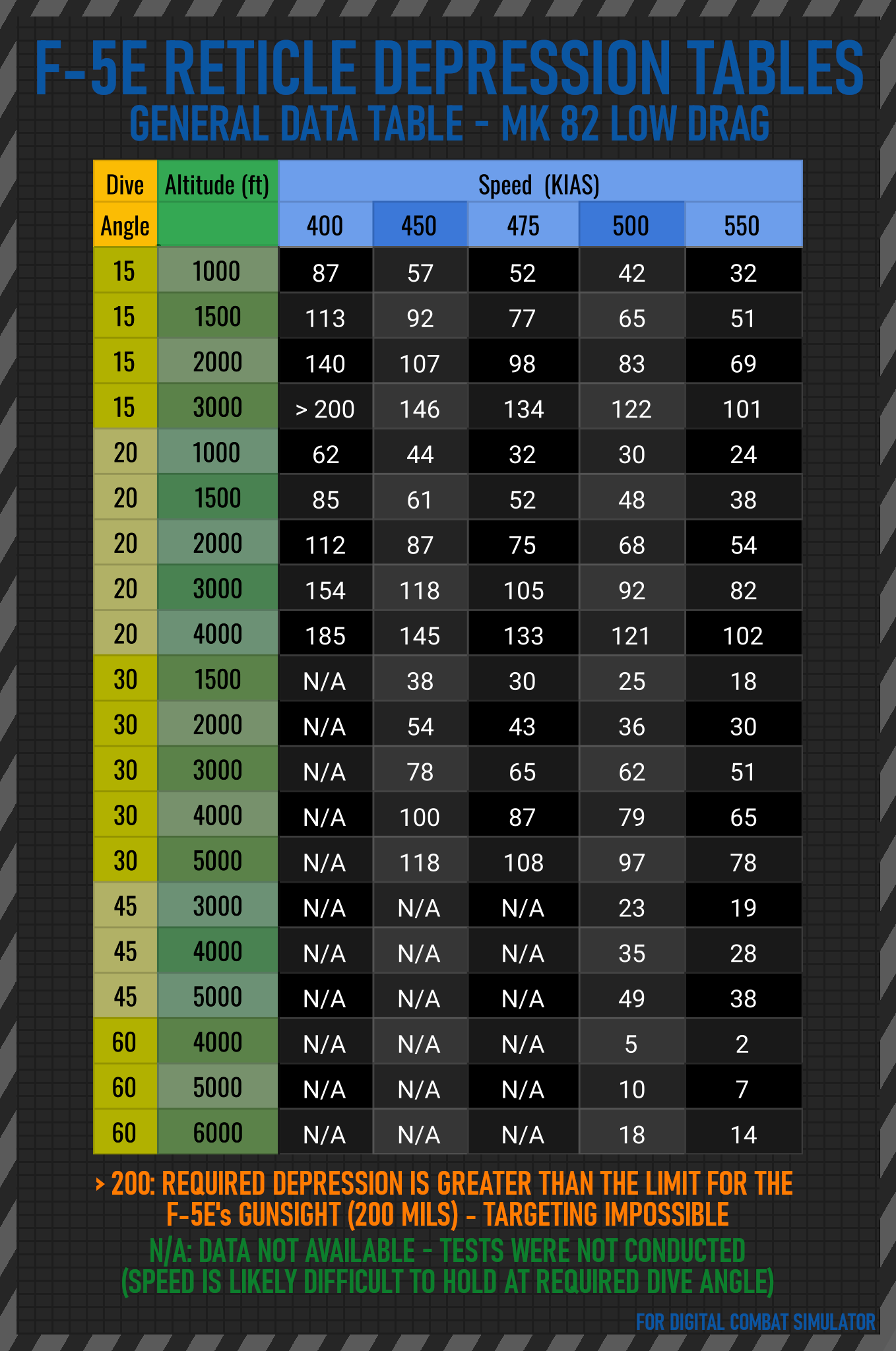 Note that some values are marked as "over 200" and exist to show that weapons release in these conditions is impractical. Additionally, some of the profiles in the "general data" table are possible but not necessarily practical - some for instance might result in dive recoveries that end up too close to the ground. Warnings are given in the tables wh ere it is felt they are necessary.