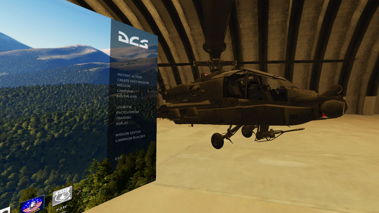 If I'm flying in VR, I always like to see my ride parked in my hangar.  Just got the noble and mighty Apache so there he is, pride of place.