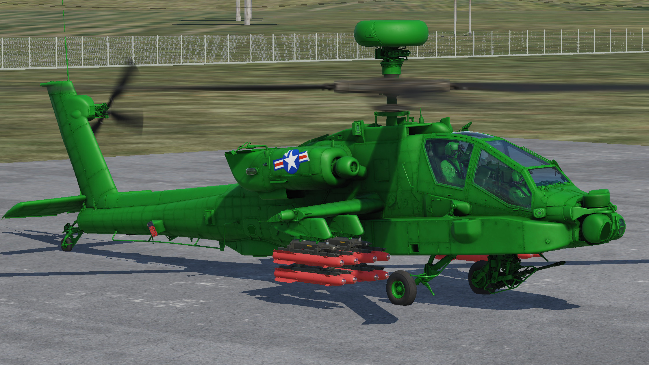 Now YOU can bring the hurt to the Tan Army with the new Green Army Plastic Apache! Fire your Guided Red Bottle Rockets and eliminate the Tan menace! Quick, switch to the Dumbfire Rockets to eliminate that Tan convoy! OH NO! You're too close for rockets! Switch to guns! Watch the Tan soldiers melt as your plastic bullets decimate their battalions!