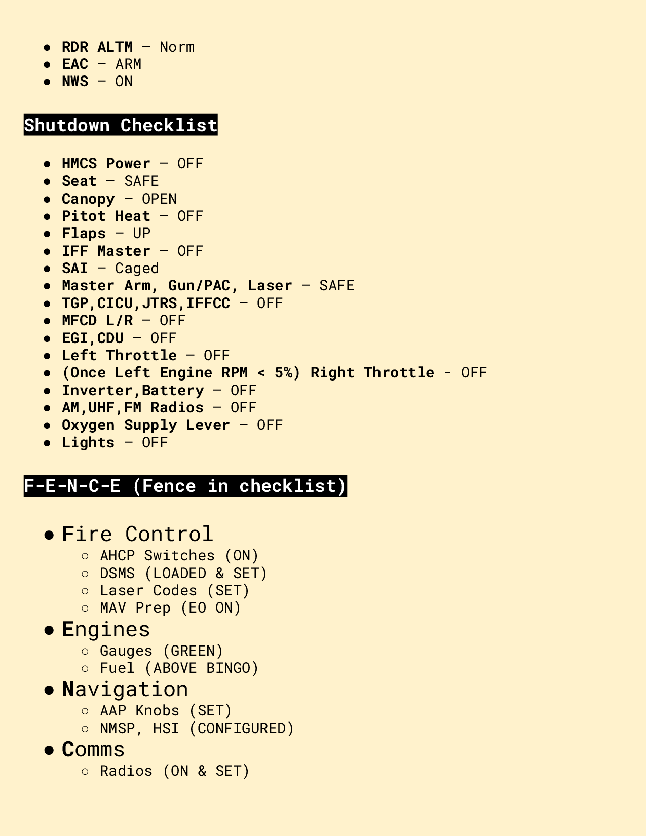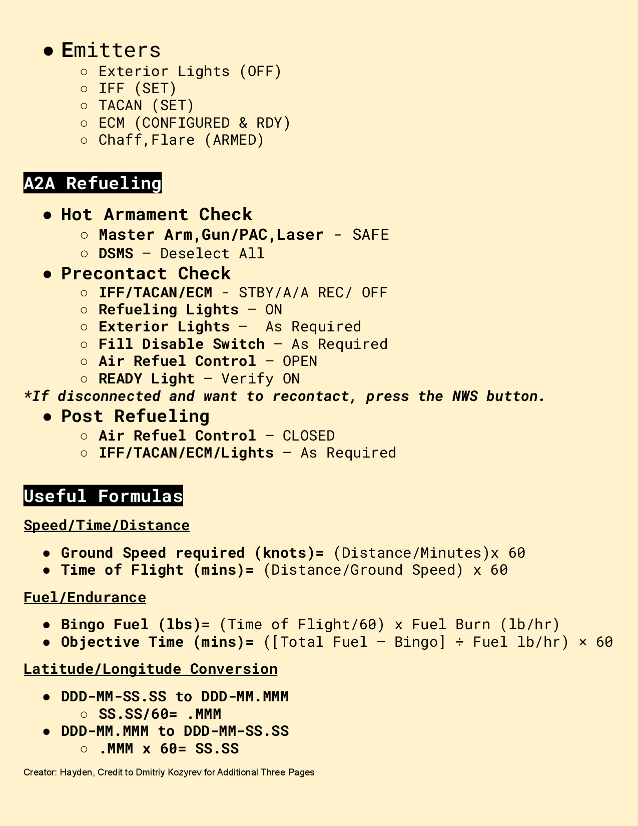 This is the second kneeboard pack I have created in this format, it is intended for people who want to be able to cold start and effectively use an aircraft without doing an 80 point startup procedure full of unnecessary tests and "checks". It also contains some other useful info written in such a way that it is easy to quickly reference while flying. The last three pages (HOTAS, Armament, RWR) are not mine, I found them in another kneeboard pack and could not imagine flying the Warthog without them.