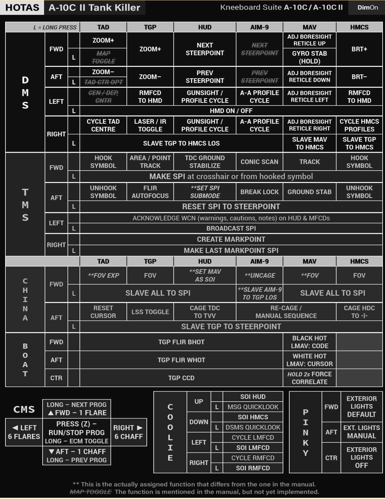 A quick reference kneeboard pack for the A-10C II Tank Killer. Contains quick startup and shutdown procedures, F-E-N-C-E in checklist, A2A refueling checklist, useful formulas, nineline assistant, as well as a HOTAS chart, ordnance chart, and RWR chart.