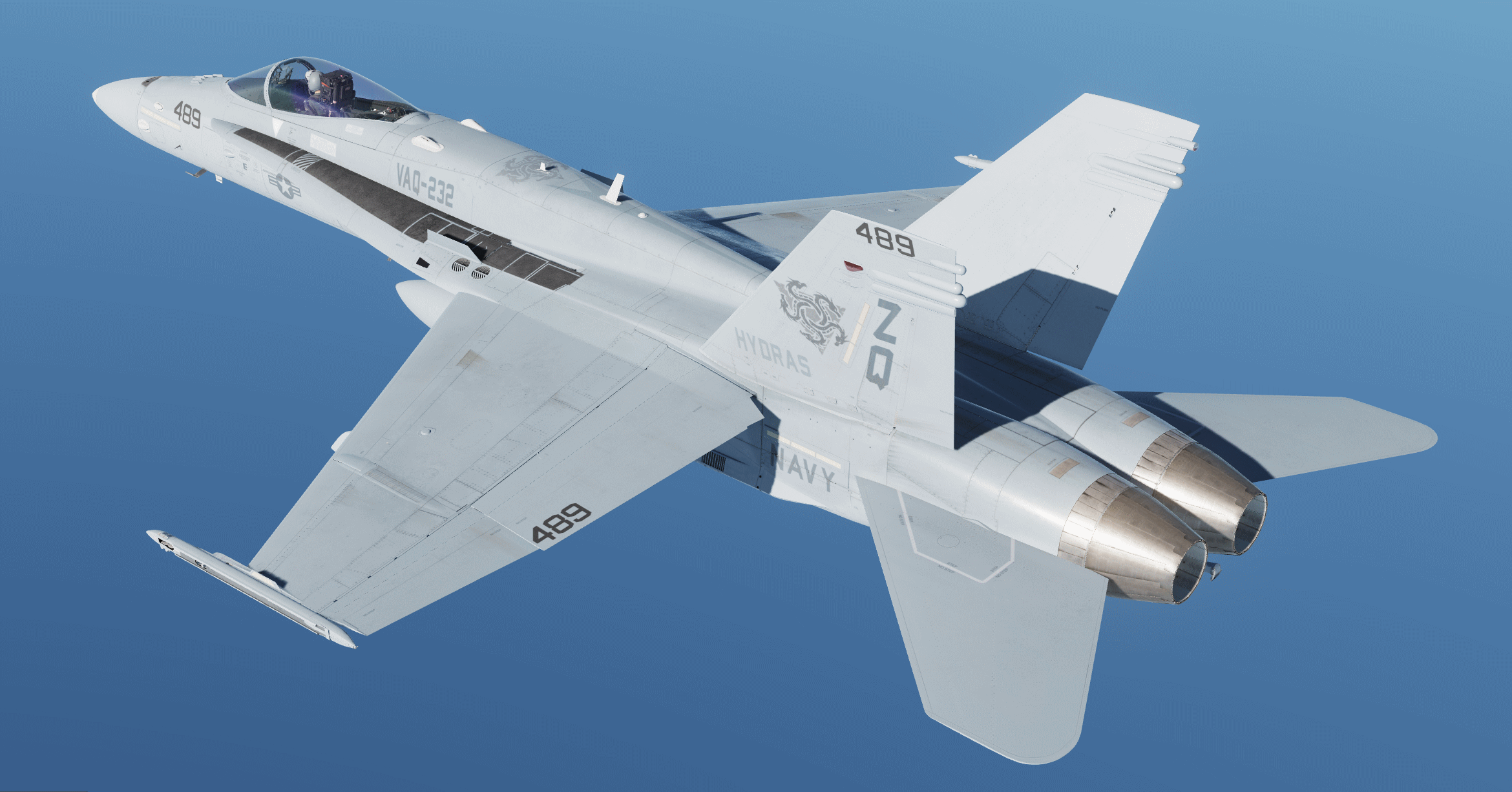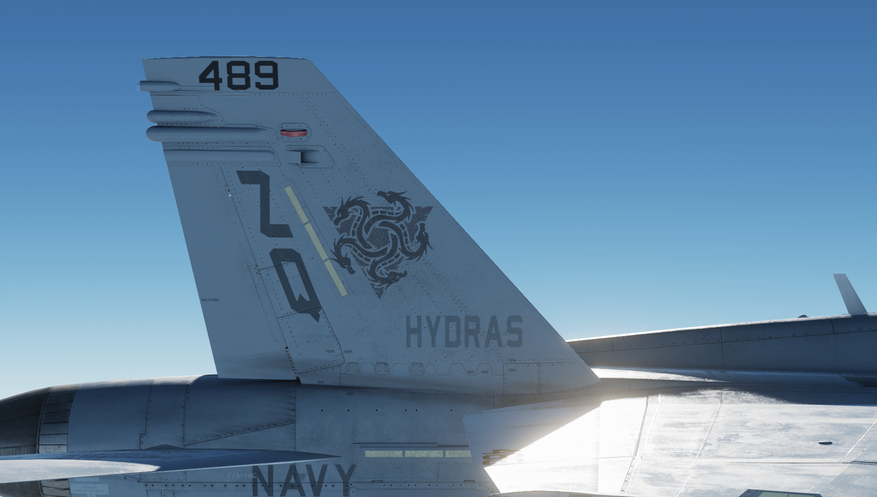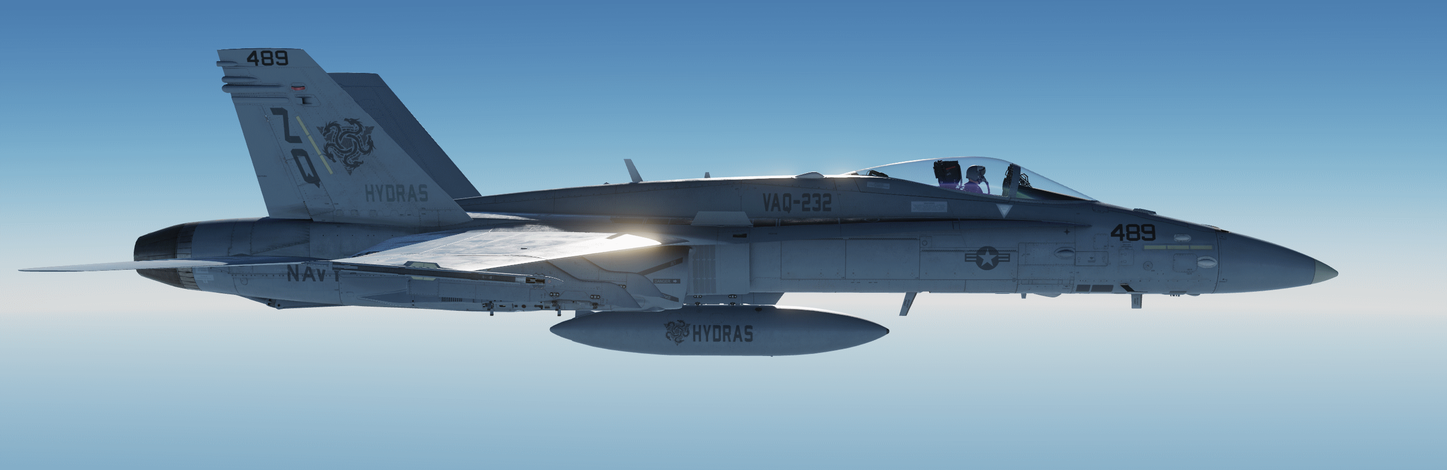 I created a counter-shaded livery for a fictitious carrier-based SEAD-specializing Navy squadron. For now, the skin just uses the F18. I do see Growler mods out there, so I may take a crack at adding a livery for it, as that would be more realistic to have a VAQ squadron using EA-18G Growlers instead of FA-18C Hornets. Also includes a skinned fuel tank.