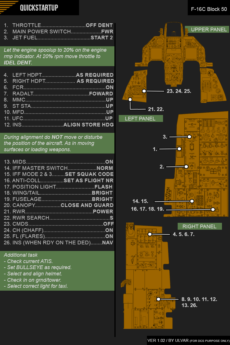 This is my take on a quick startup checklist for the F-16c Block 50 in DCS. The procedure is based on Chucks guidelines for the F-16. The graphics is inspired by the wonderful checklist from Minsky.