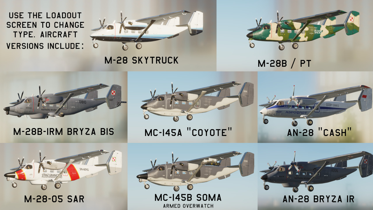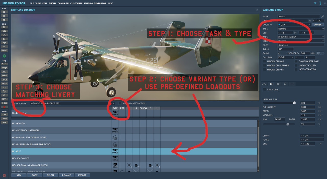 This mod includes multiple variants of the M-28 / MC-145 / AN-28 using loadouts to choose the various configurations. The types are split between two plane "assets" which are displayed as the 'M-28/MC-145 (CLP)' and 'An-28/BRYZA (CLP)' in the Mission Editor - alphabetically listed with the C's (Cowboy's Livery Pack M-28/An-28).